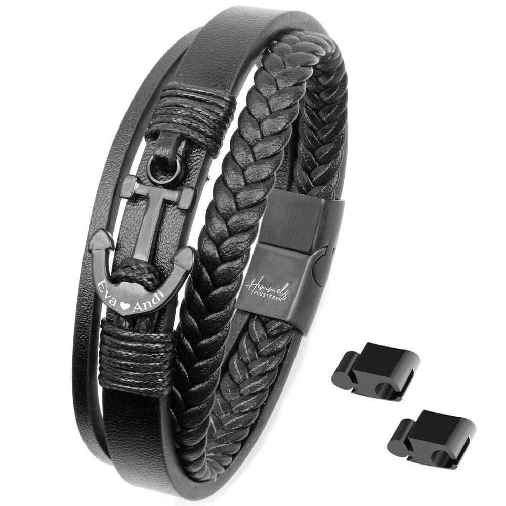Gravurarmband für Herren aus echtem Leder und einem Edelstahl-Anker. Die Besonderheit: Das Armband besitzt zwei abnehmbare, magnetische Verlängerungsglieder, sodass Du das Armband in den Längen 21 cm, 22.5 cm und 24 cm variabel einstellen kannst. Damit ist gewährleistet, dass das Gravurarmband an jedes Herren-Handgelenk passt. Das hochwertige Echt-Lederund der massive Edelstahl sorgen für höchsten Tragekomfort und für ein maskulines Aussehen. So ist das Armband ein Top-Accessoire für echte Typen. Einzigartiger Herren-Schmuck - auch das ist Himmelsflüsterer!