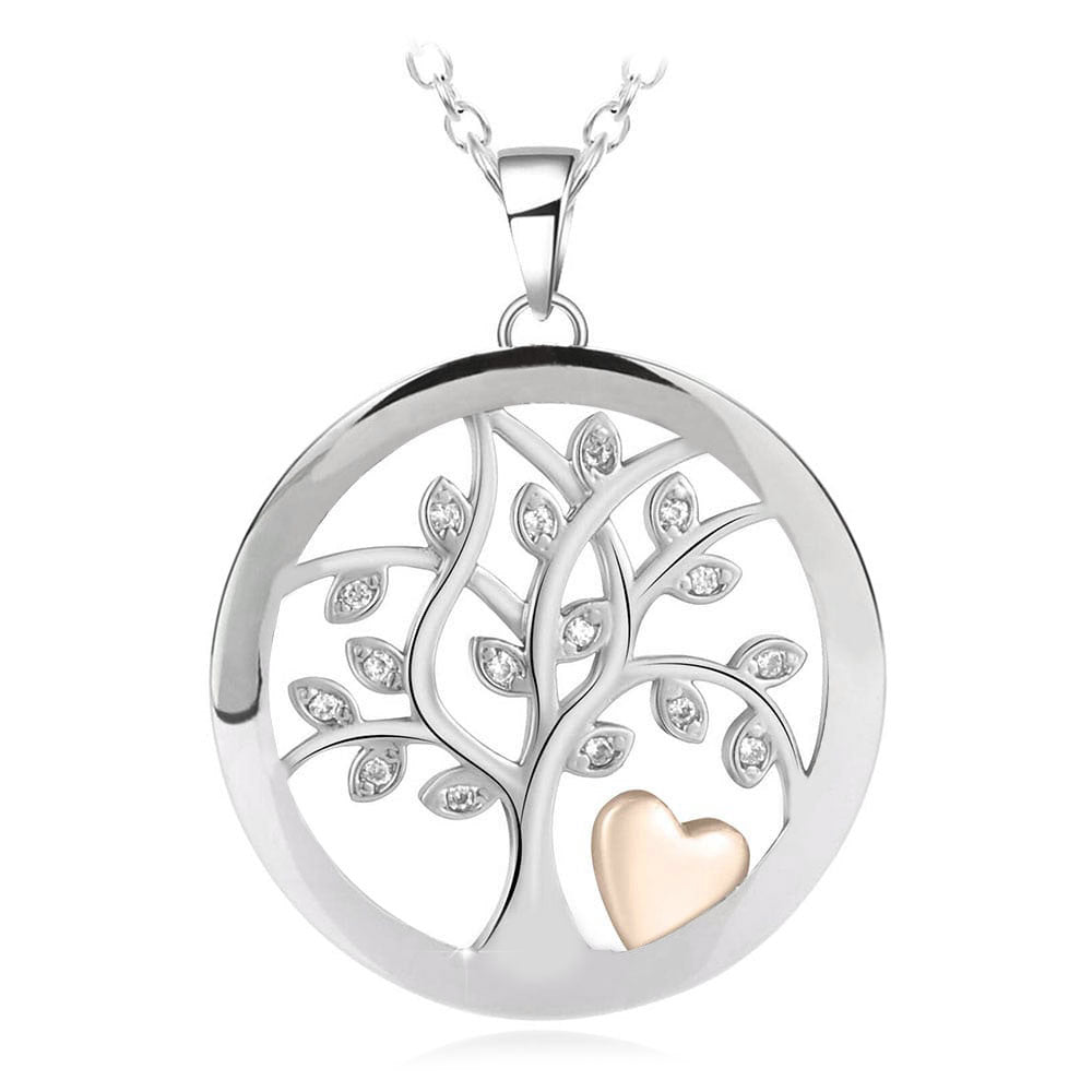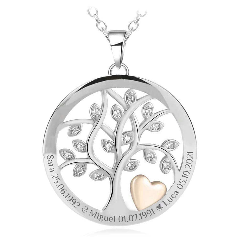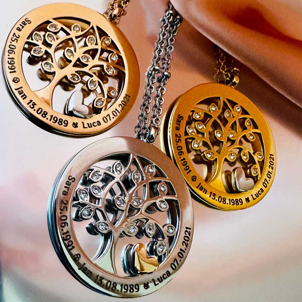 Lebensbaum Gravur-Halskette "Liebe" mit weißem Kristall. Unser Lebensbaum lässt sich auf seinem Rand mit deiner ganz persönlichen Lieblingsgravur veredeln. Ein Lebensbaum ist das Symbol für Familie & Liebe. Genau diese Liebe symbolisiert auch das feine Herz, das von den Ästen des Baumes behütet und beschützt wird. Da der Lebensbaum über die Wurzeln mit der Erde und über die Baumkrone mit dem Himmel verbunden ist, gibt er jeder Familie Halt, Liebe und Hoffnung. Die Halskette ist 50,0 cm lang, sodass der Lebensbaum von jeder Dame getragen werden kann.