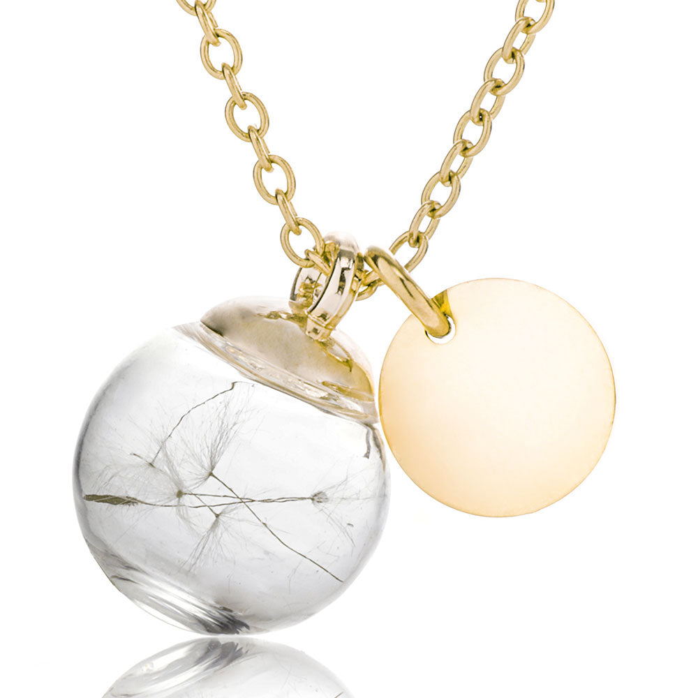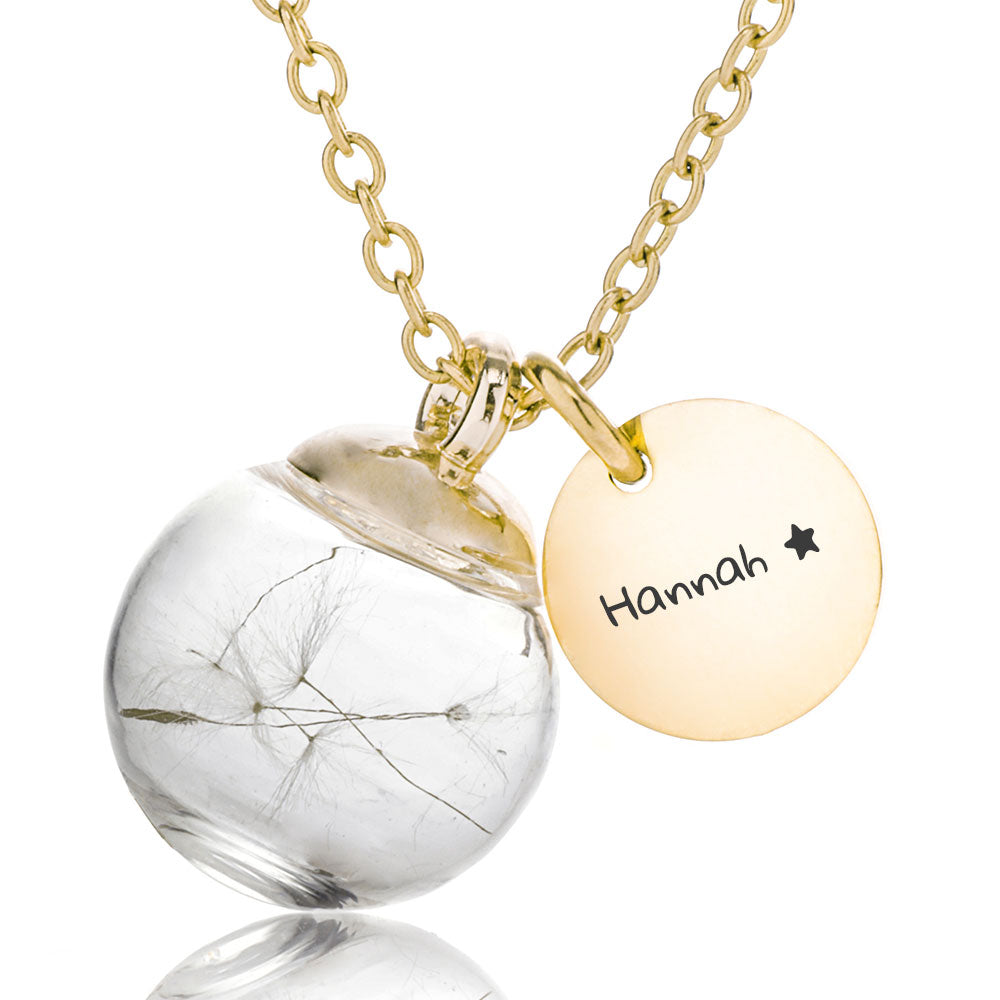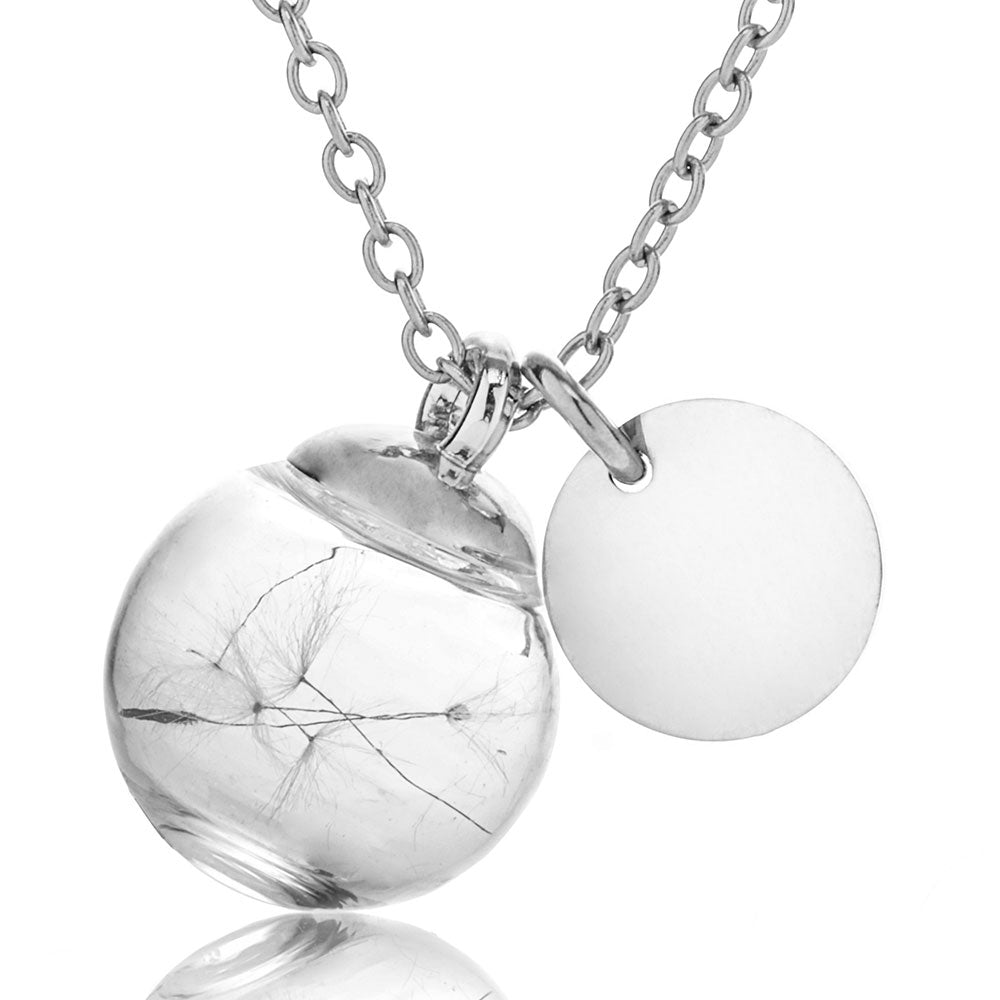 Die Halskette trägt eine Glaskugel mit einer echten Pusteblume darin, damit all deine Wünsche in Erfüllung gehen mögen! Daneben hängt eine gravierbare Memory-Plakette für ewige Erinnerungs-Gravuren. Die feine Halskette ist mit 45 cm bis 55 cm ideal auf deine Wunschlänge einstellbar, sodass das hochwertige Schmuckstück ganz nach deinem Geschmack getragen werden kann. Da sie aus Edelstahl besteht, ist das Schmuckstück besonders verträglich.