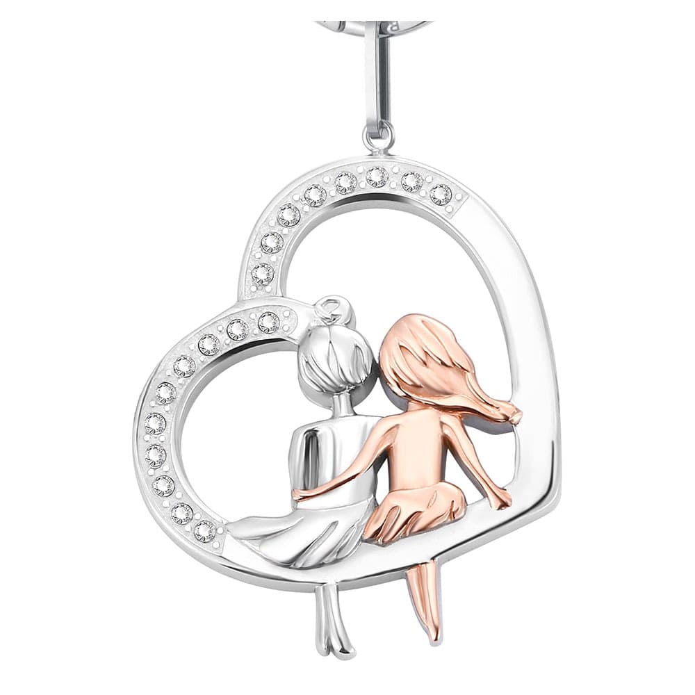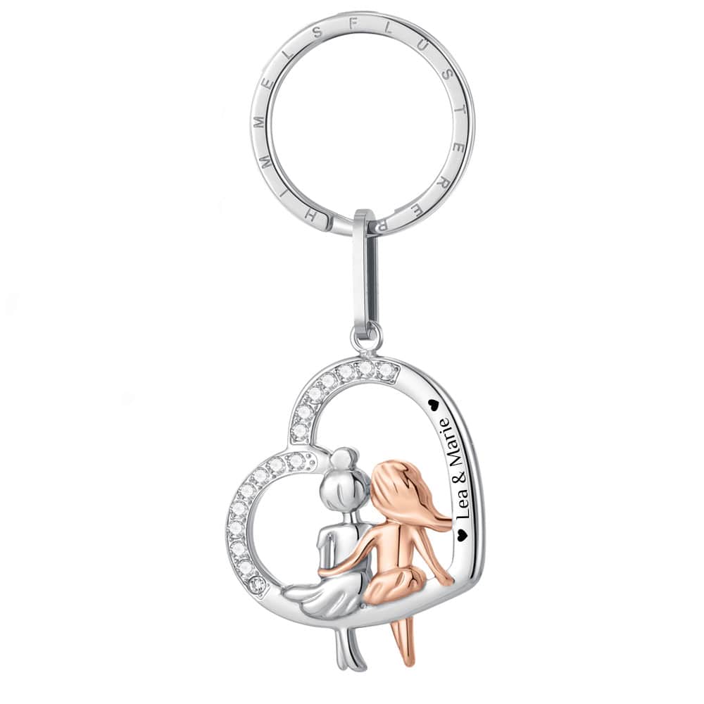 Herz-Gravur-Schlüsselanhänger "Friends". In dem mit kleinen Kristallen verzierten Herz sitzen zwei Beste Freundinnen. Diese können aber auch ein Symbol für Mama & Tochter, Oma & Enkelin, zwei Schwestern, Beste Kolleginnen und so weiter sein. Ein zuckersüßes Schmuckstück für die Ewigkeit!