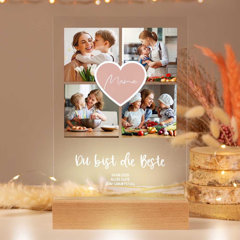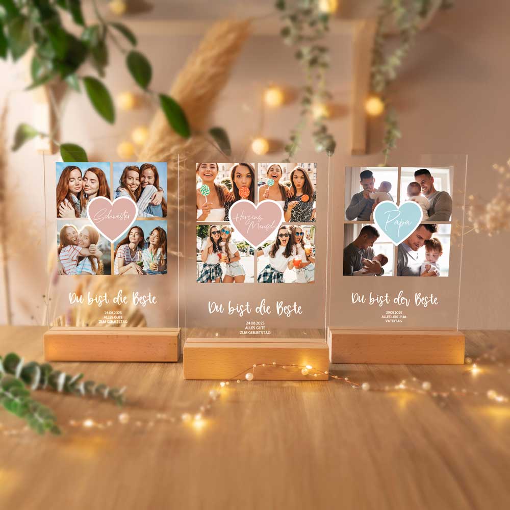 Erstelle dein eigenes ganz persönliches „Fotocollage #2“ Bild als unglaublich schönes Geschenk und verschenke es auf einem Acrylglas mit Holzfuß (DIN A5).