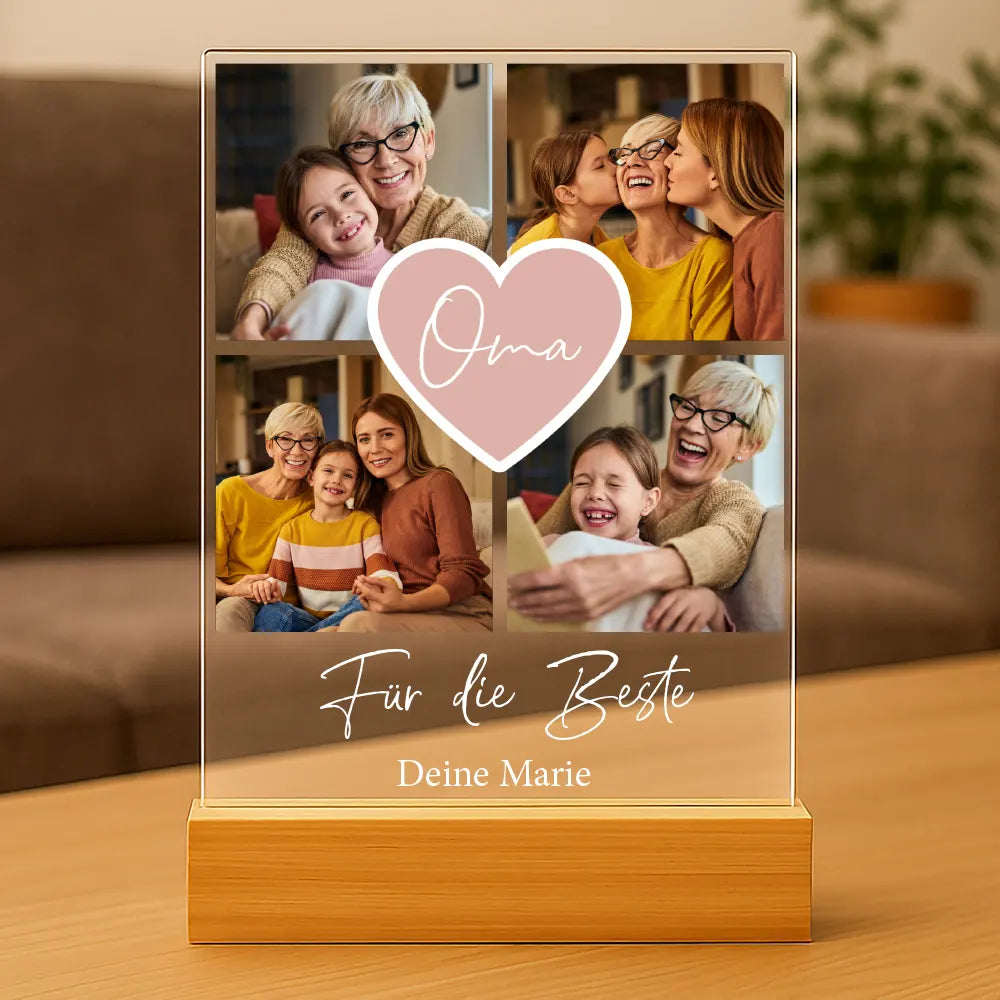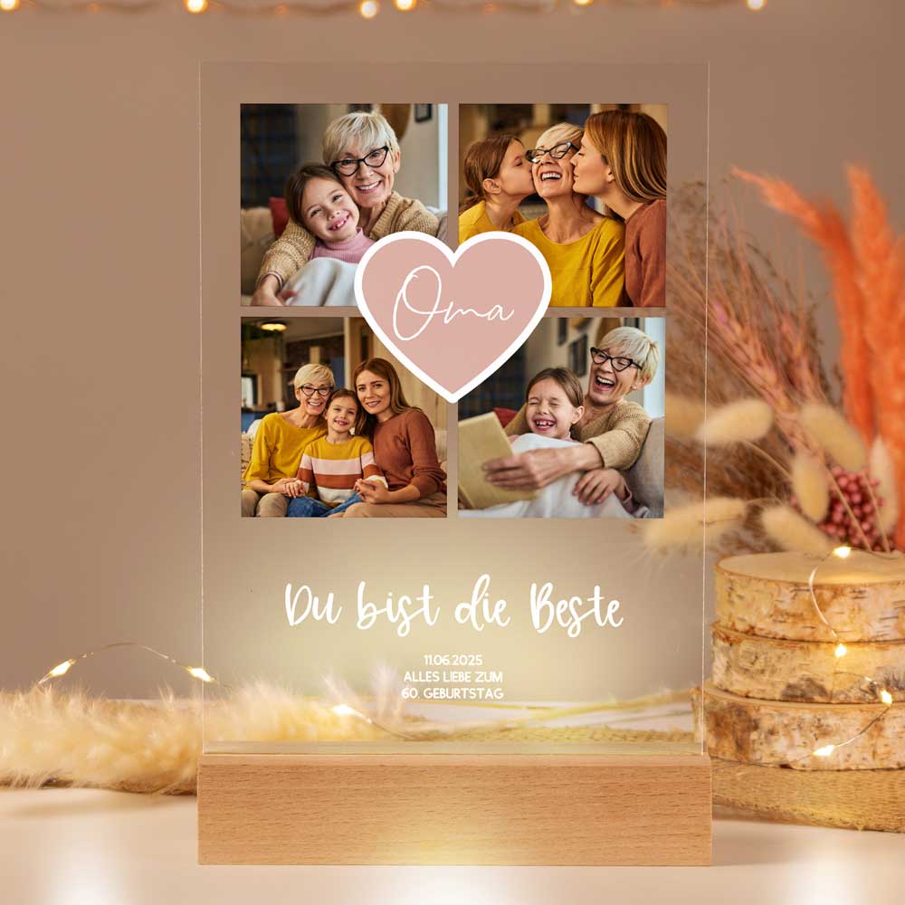 Erstelle dein eigenes ganz persönliches „Fotocollage #2“ Bild als unglaublich schönes Geschenk und verschenke es auf einem Acrylglas mit Holzfuß (DIN A5).