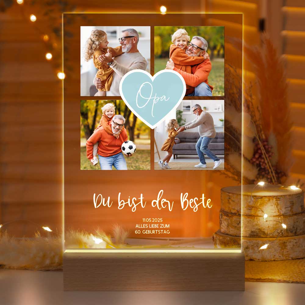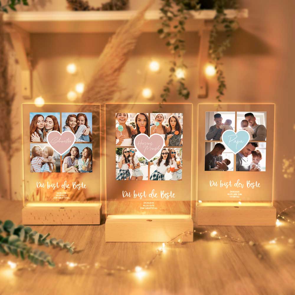 Erstelle dein eigenes ganz persönliches „Fotocollage #2“ Bild als unglaublich schönes Geschenk und verschenke es auf einer LED-Lampe aus Acrylglas (DIN A5).