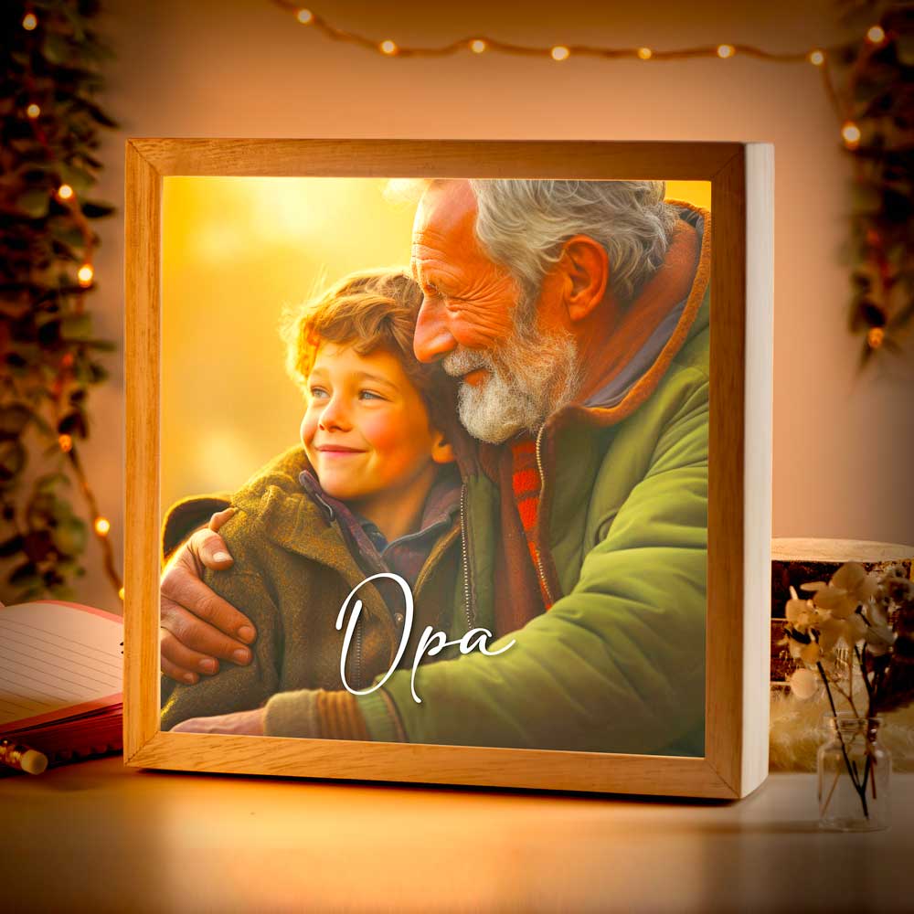 Lade dein eigenes Foto hoch und wir erstellen dir deinen ganz persönlichen, leuchtenden Bilderrahmen aus Holz (Größe 20x20 cm).