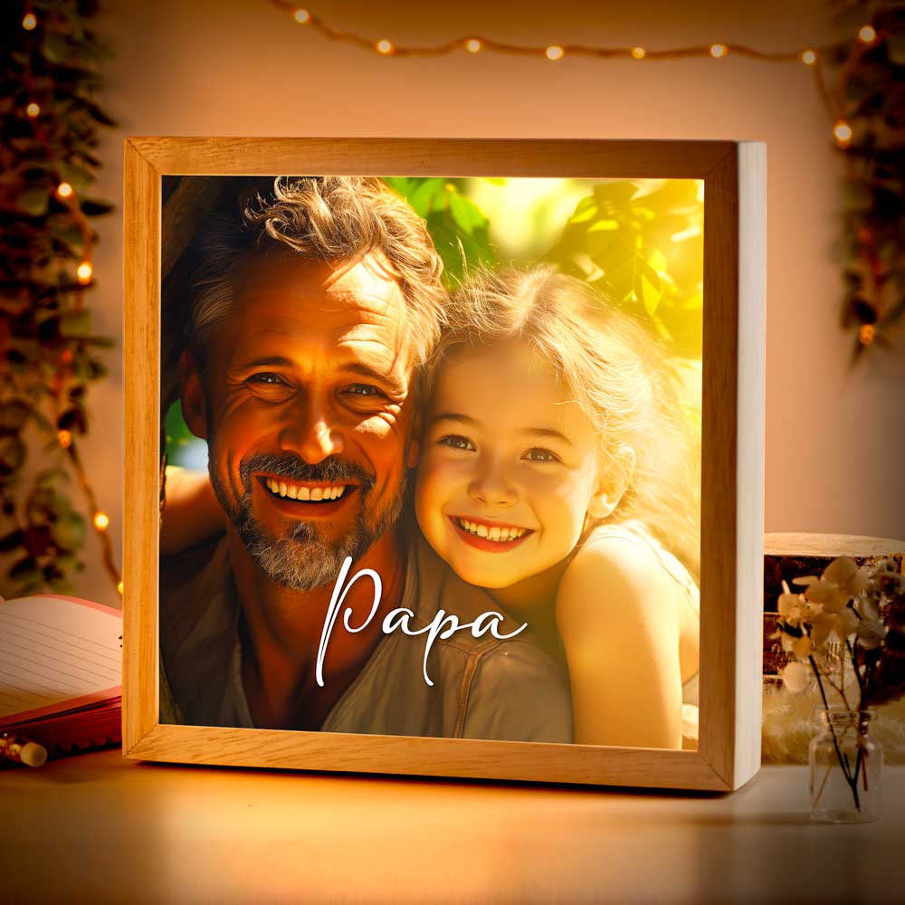 Lade dein eigenes Foto hoch und wir erstellen dir deinen ganz persönlichen, leuchtenden Bilderrahmen aus Holz (Größe 20x20 cm).