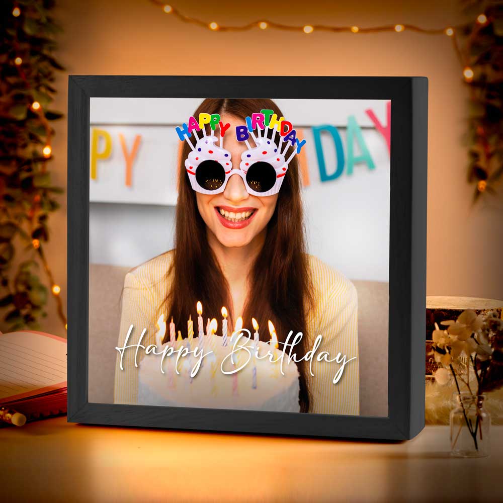 Lade dein eigenes Foto hoch und wir erstellen dir deinen ganz persönlichen, leuchtenden Bilderrahmen aus Holz (Größe 20x20 cm).