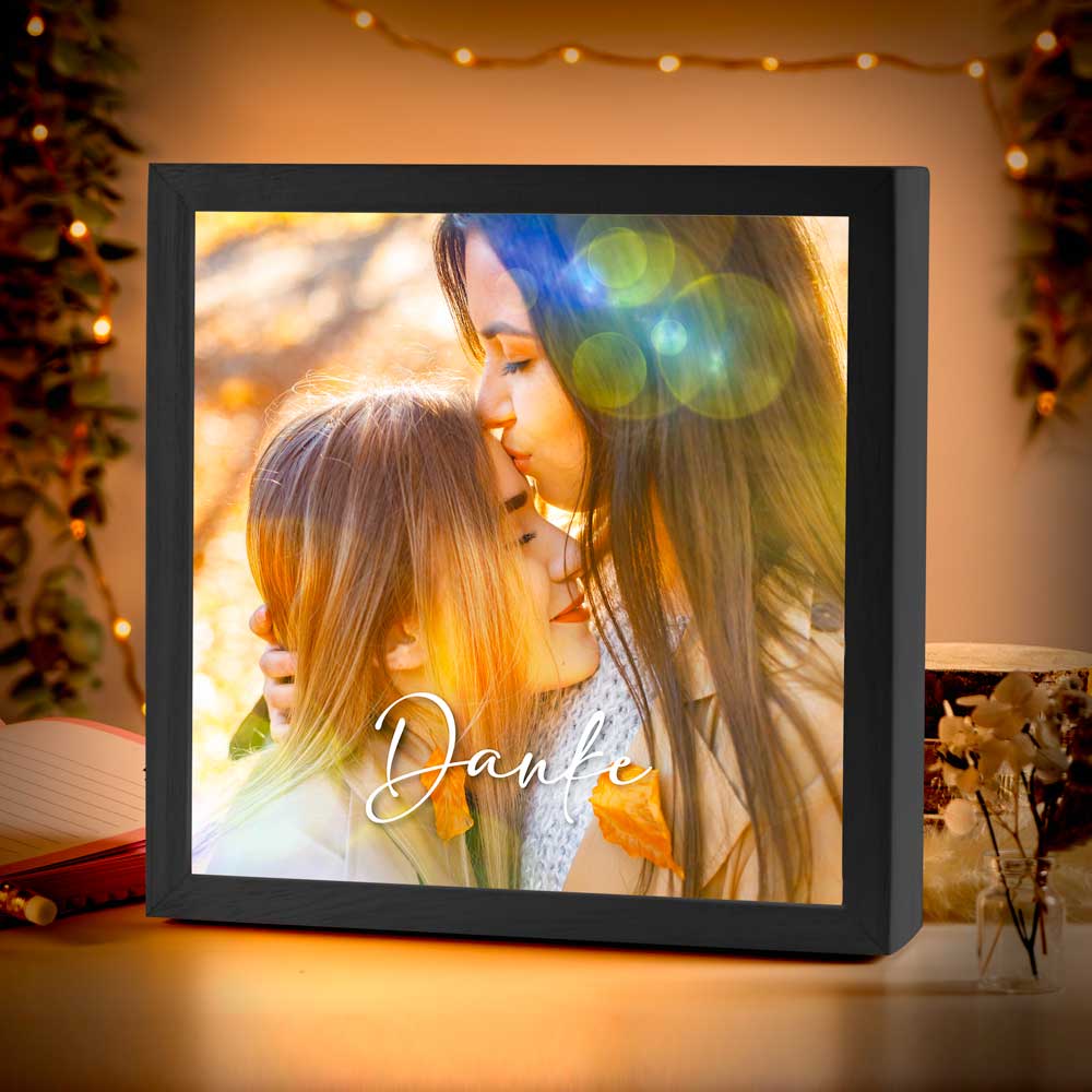 Lade dein eigenes Foto hoch und wir erstellen dir deinen ganz persönlichen, leuchtenden Bilderrahmen aus Holz (Größe 20x20 cm).