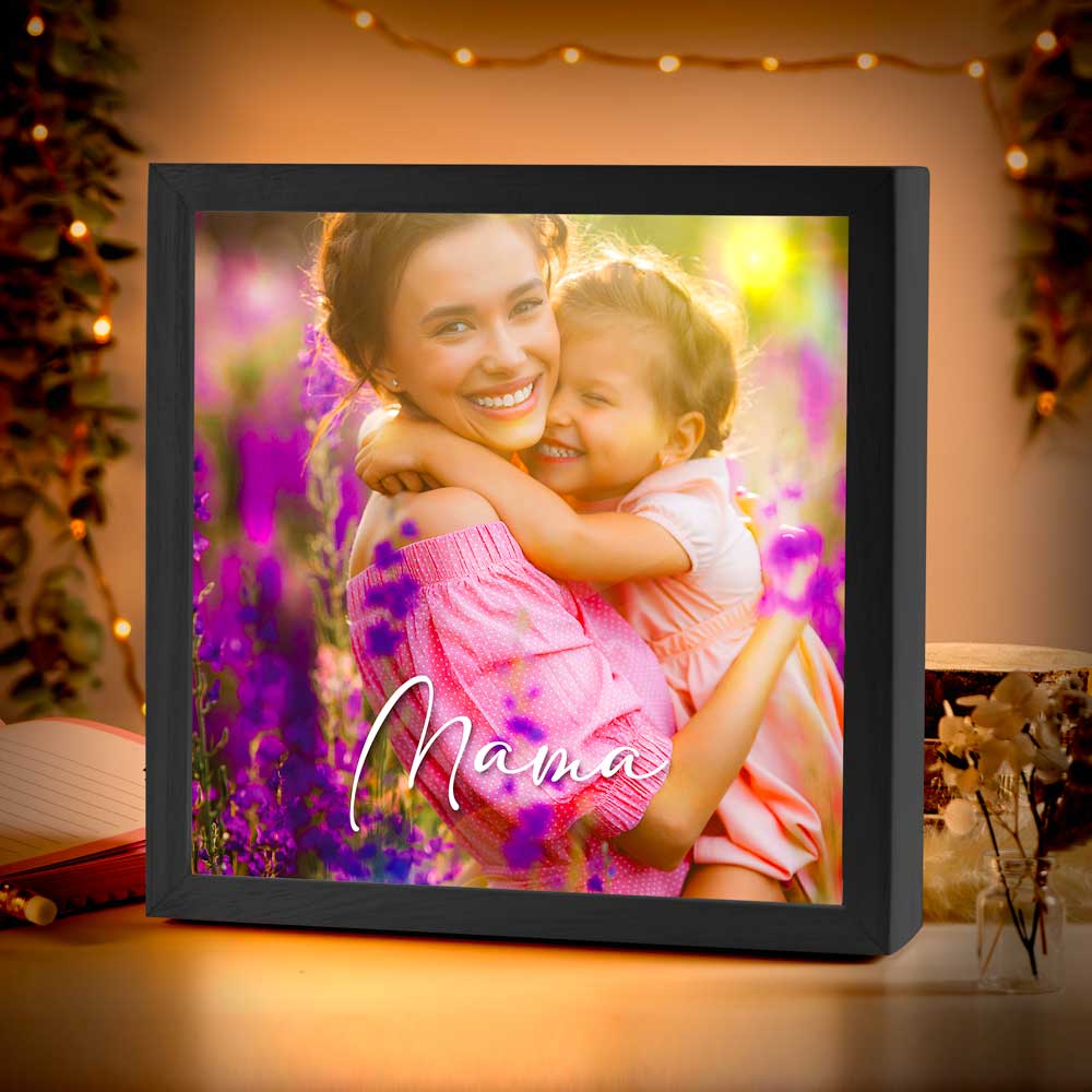 Lade dein eigenes Foto hoch und wir erstellen dir deinen ganz persönlichen, leuchtenden Bilderrahmen aus Holz (Größe 20x20 cm).