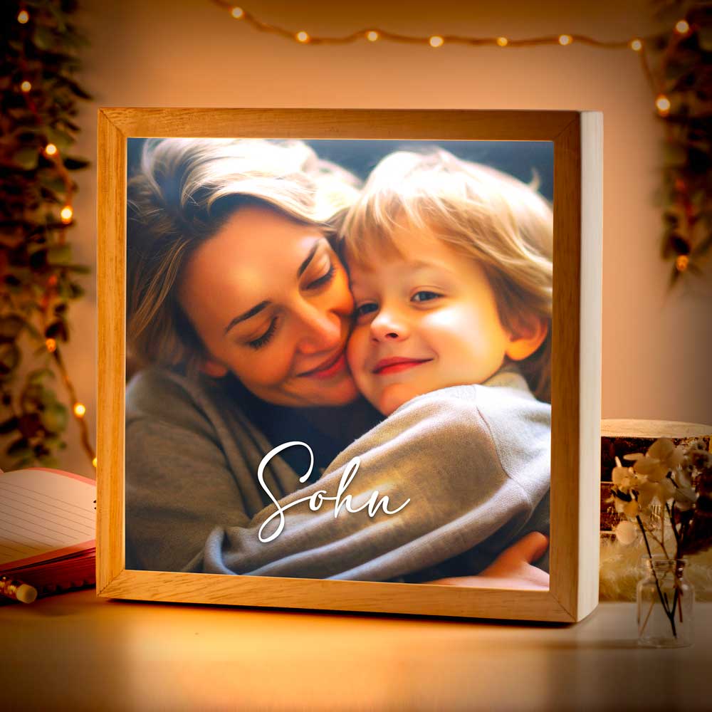 Lade dein eigenes Foto hoch und wir erstellen dir deinen ganz persönlichen, leuchtenden Bilderrahmen aus Holz (Größe 20x20 cm).