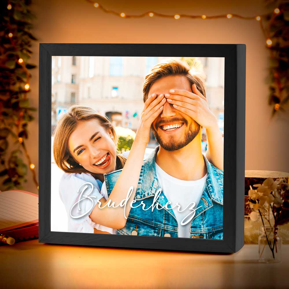 Lade dein eigenes Foto hoch und wir erstellen dir deinen ganz persönlichen, leuchtenden Bilderrahmen aus Holz (Größe 20x20 cm).