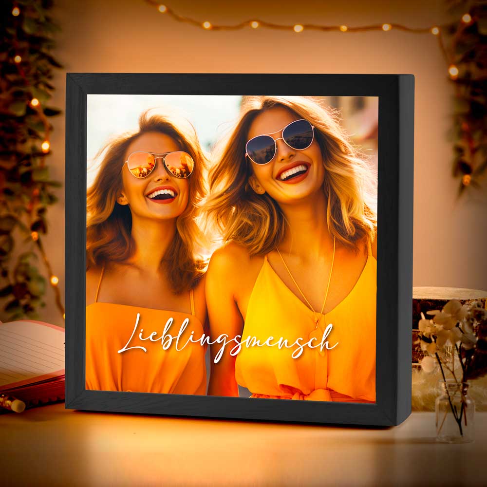 Lade dein eigenes Foto hoch und wir erstellen dir deinen ganz persönlichen, leuchtenden Bilderrahmen aus Holz (Größe 20x20 cm).