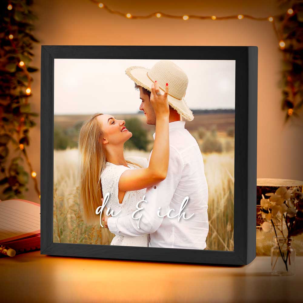 Lade dein eigenes Foto hoch und wir erstellen dir deinen ganz persönlichen, leuchtenden Bilderrahmen aus Holz (Größe 20x20 cm).