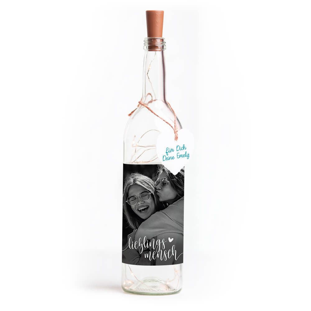Personalisierte Deko-Glasflasche mit Lichterkette für einen lieben Menschen, der dir nahe steht. Lade dein eigenes Foto hoch und wir erstellen dir dein ganz persönliches Geschenk. Unsere Deko-Flasche ist mit einer Lichterkette sowie mit einem weißen Papier-Herz mit Kordel veredelt. Auf das Papierherzchen kannst du nochmals eine persönliche Widmung schreiben. Bei Dunkelheit spendet die galante Flasche ein warmes Licht und sorgt für ein angenehmes Wohlgefühl. Die Flasche ist ein niedliches Geschenk für besondere Anlässe. Sie ist ein Symbol einer ganz besonderen Verbindung zwischen dir und einem lieben Menschen. Damit du die Flasche direkt verschenken kannst, ist die Batterie bereits inklusive! Geschenke für einzigartige Momente des Glücks - das ist Himmelsflüsterer.