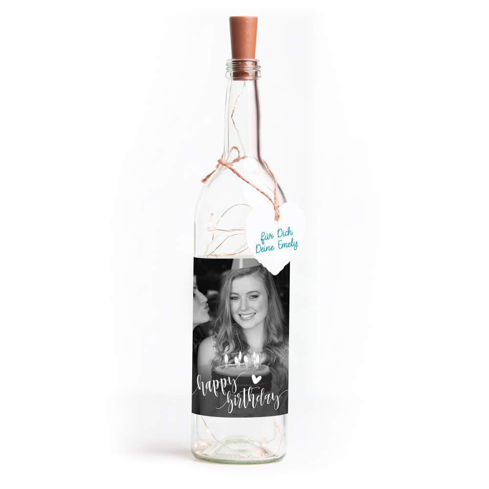 Personalisierte Deko-Glasflasche mit Lichterkette für einen lieben Menschen, der dir nahe steht. Lade dein eigenes Foto hoch und wir erstellen dir dein ganz persönliches Geschenk. Unsere Deko-Flasche ist mit einer Lichterkette sowie mit einem weißen Papier-Herz mit Kordel veredelt. Auf das Papierherzchen kannst du nochmals eine persönliche Widmung schreiben. Bei Dunkelheit spendet die galante Flasche ein warmes Licht und sorgt für ein angenehmes Wohlgefühl. Die Flasche ist ein niedliches Geschenk für besondere Anlässe. Sie ist ein Symbol einer ganz besonderen Verbindung zwischen dir und einem lieben Menschen. Damit du die Flasche direkt verschenken kannst, ist die Batterie bereits inklusive! Geschenke für einzigartige Momente des Glücks - das ist Himmelsflüsterer.