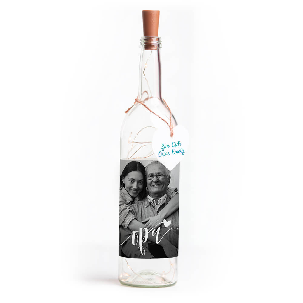 Deko-Glasflasche Nr. 7 "Foto" als personalisiertes Geschenk mit Lichterkette | Fotogeschenk | inkl. Batterien