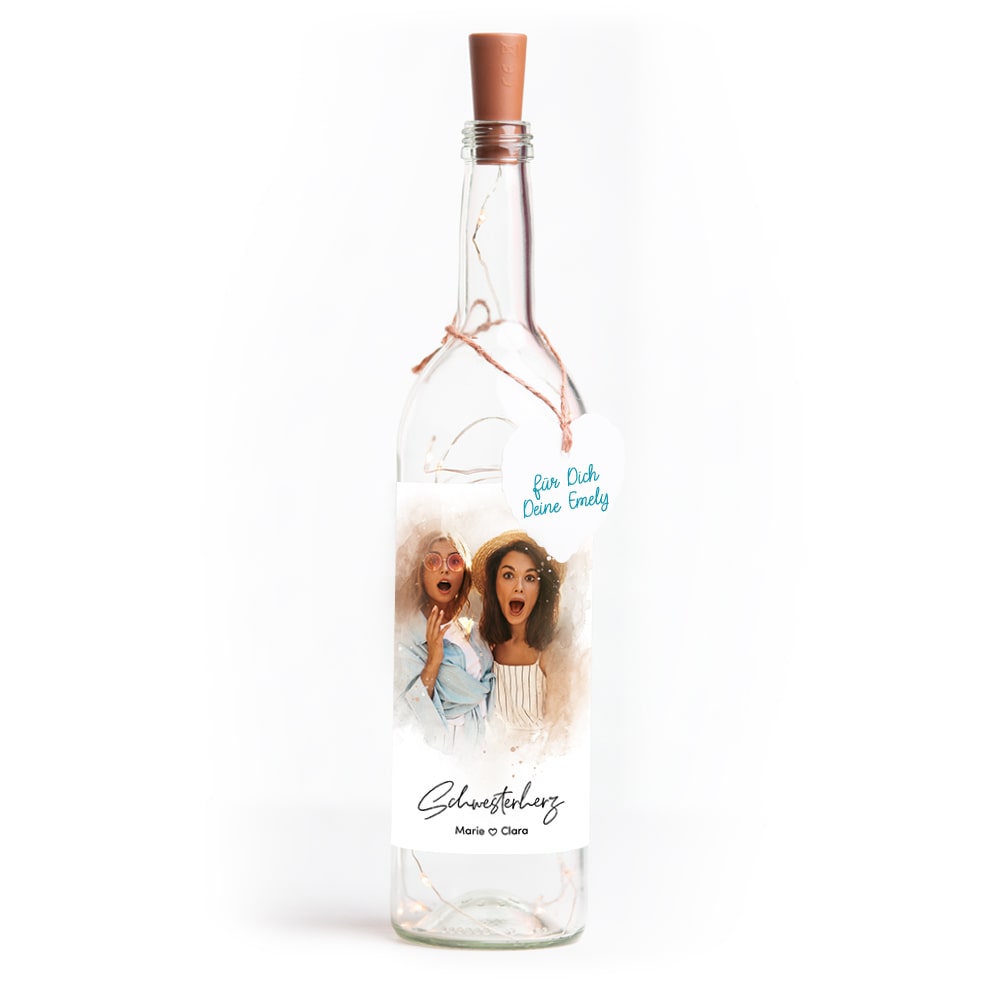 Personalisiere deine Deko-Glasflasche mit Lichterkette mit deinem Lieblingsbild, welches wir dir im super edlen Aquarell-Design auf die Lichterflasche drucken.