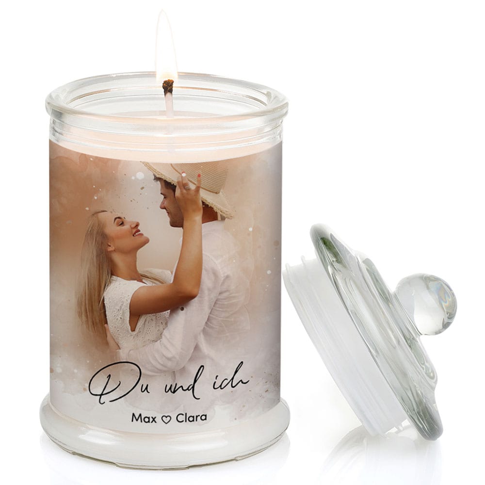 Personalisiere deine Duft-Kerze mit deinem Lieblingsbild, welches wir dir im einzigartigen Aquarell-Design auf das Kerzenglas drucken.