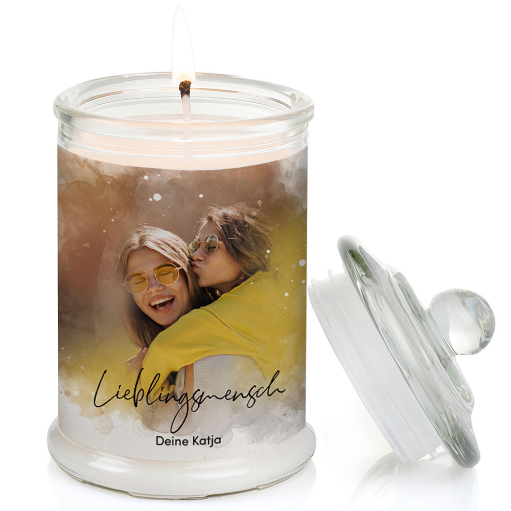 Personalisiere deine Duft-Kerze mit deinem Lieblingsbild, welches wir dir im einzigartigen Aquarell-Design auf das Kerzenglas drucken.