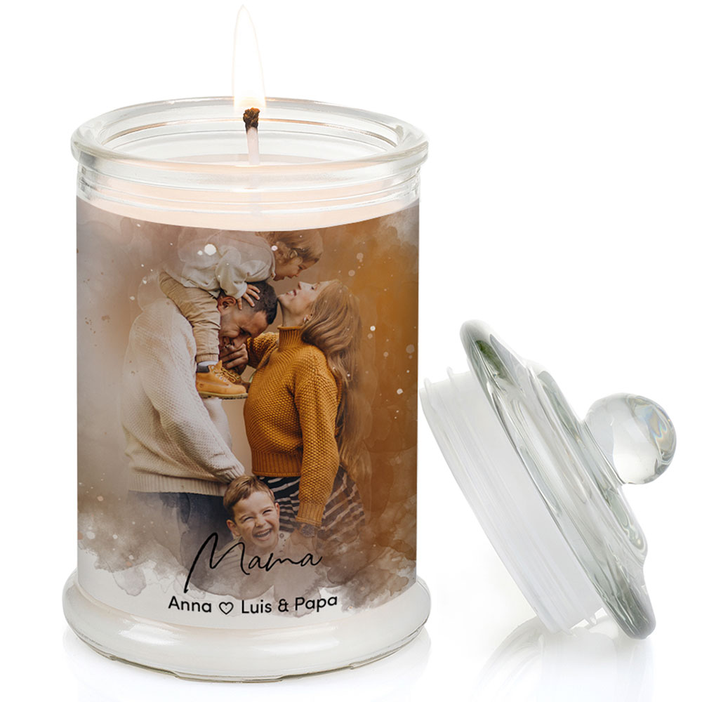 Personalisiere deine Duft-Kerze mit deinem Lieblingsbild, welches wir dir im einzigartigen Aquarell-Design auf das Kerzenglas drucken.