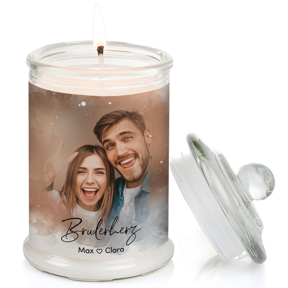 Personalisiere deine Duft-Kerze mit deinem Lieblingsbild, welches wir dir im einzigartigen Aquarell-Design auf das Kerzenglas drucken.