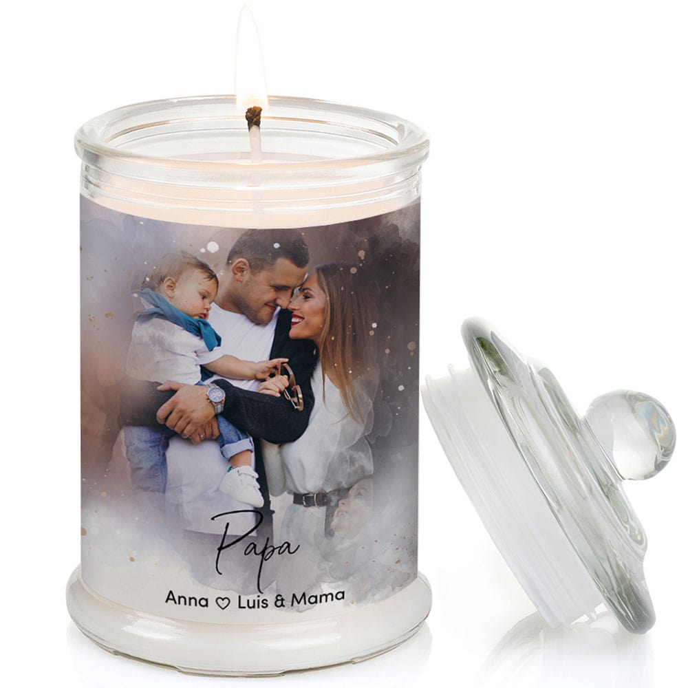 Personalisiere deine Duft-Kerze mit deinem Lieblingsbild, welches wir dir im einzigartigen Aquarell-Design auf das Kerzenglas drucken.