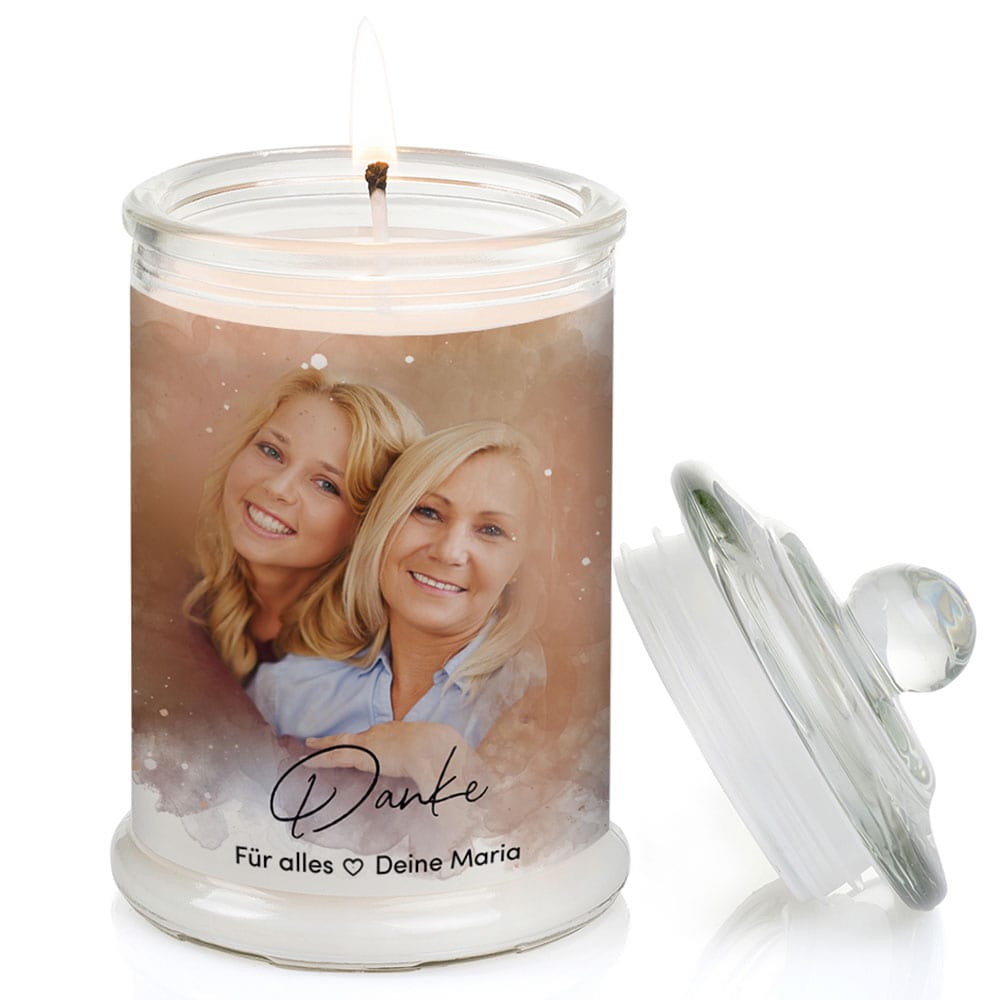 Personalisiere deine Duft-Kerze mit deinem Lieblingsbild, welches wir dir im einzigartigen Aquarell-Design auf das Kerzenglas drucken.