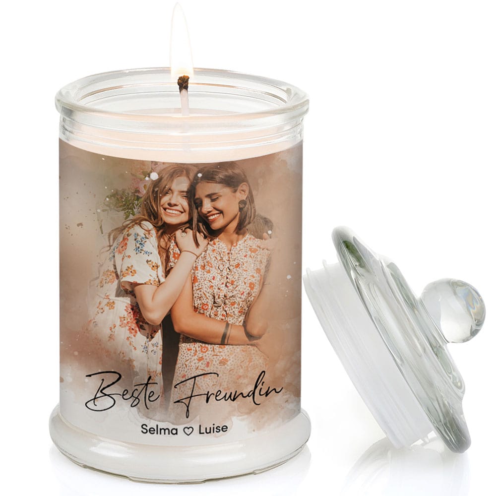Personalisiere deine Duft-Kerze mit deinem Lieblingsbild, welches wir dir im einzigartigen Aquarell-Design auf das Kerzenglas drucken.
