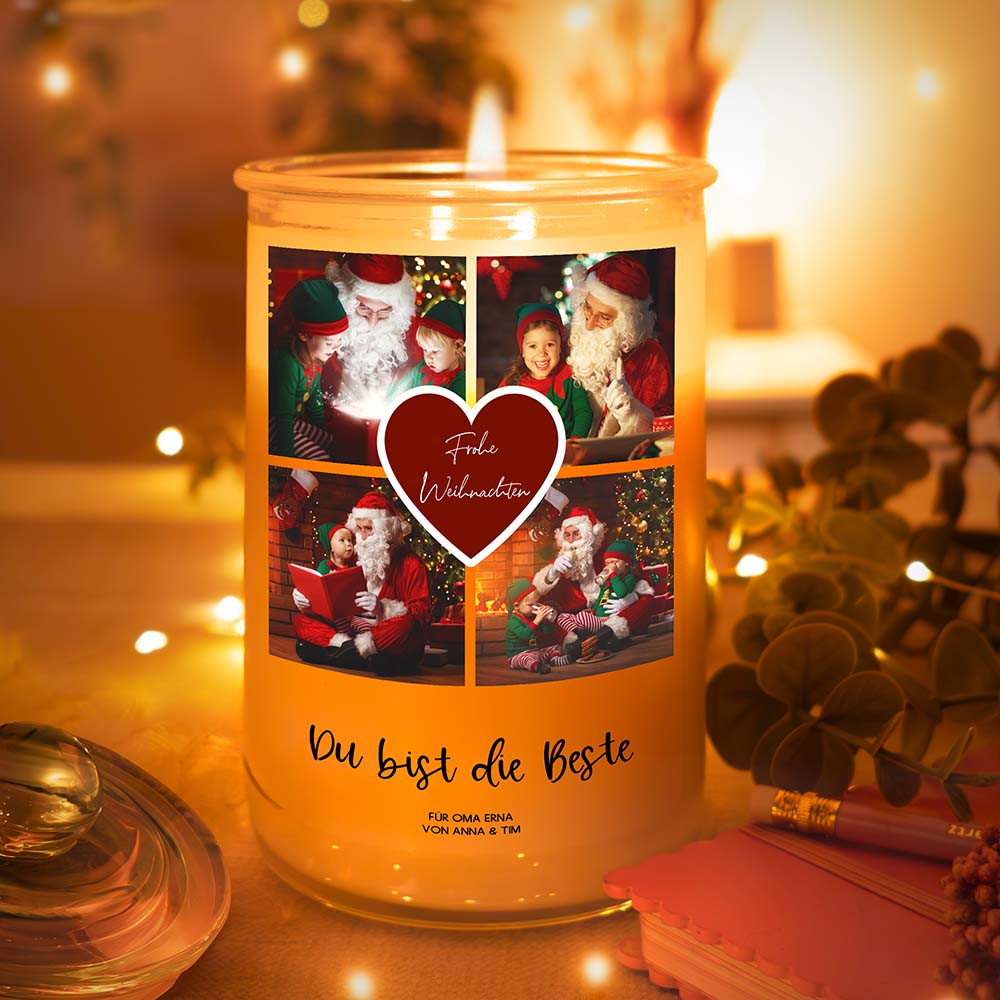 Personalisierbare Duftkerze für einen lieben Menschen, der dir nahe steht. Erstelle deine eigene ganz persönliche „Fotocollage #2“ Kerze als unglaublich schönes Geschenk. Unsere Duftkerzen werden von uns per Hand und aus 100% reinem Sojawachs gefertigt. Durch den Glasdeckel mit Gummi bleibt der Duft länger frisch und du kannst das Glas danach als dekoratives Aufbewahrungsglas verwenden! Einfach das Glas gründlich reinigen und fertig. Verwende es zur Dekoration als Windlicht, Aufbewahrungsgefäß, Teelicht - Glas oder aber als Pflanzentopf für Haus und Garten. Ideal als Geschenk zu Geburtstagen Weihnachten, Hochzeiten, zur Wohnungseinweihung oder einfach nur für Dich zum Wohlfühlen.