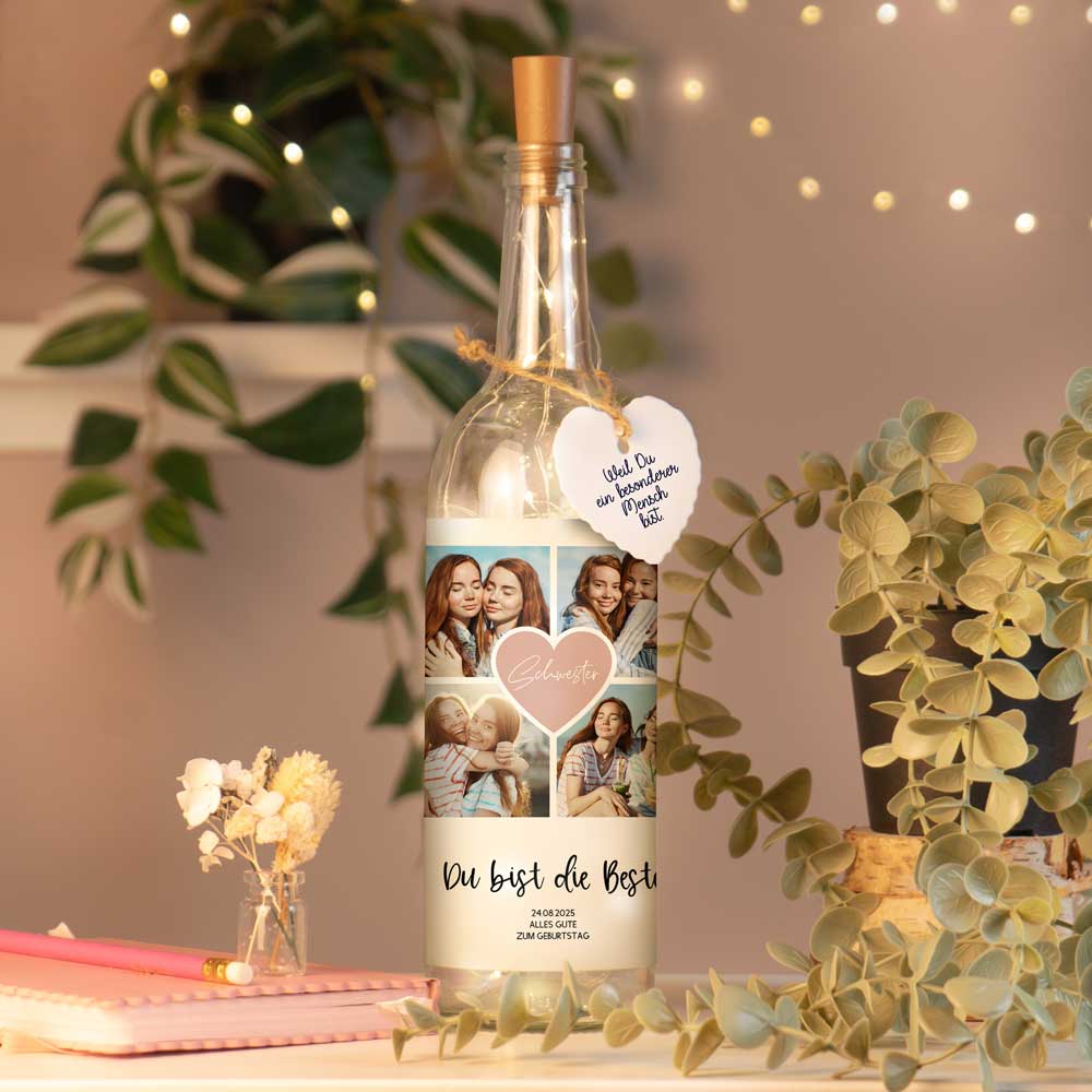 Erstelle deine eigene ganz persönliche „Fotocollage #2“ Lichterflasche und verschenke sie als unglaublich tolles Geschenk. Unsere Deko-Flasche ist mit einer Lichterkette sowie mit einem weißen Papier-Herz mit Kordel veredelt. Auf das Papierherzchen kannst du nochmals eine persönliche Widmung schreiben. Bei Dunkelheit spendet die galante Flasche ein warmes Licht und sorgt für ein angenehmes Wohlgefühl.