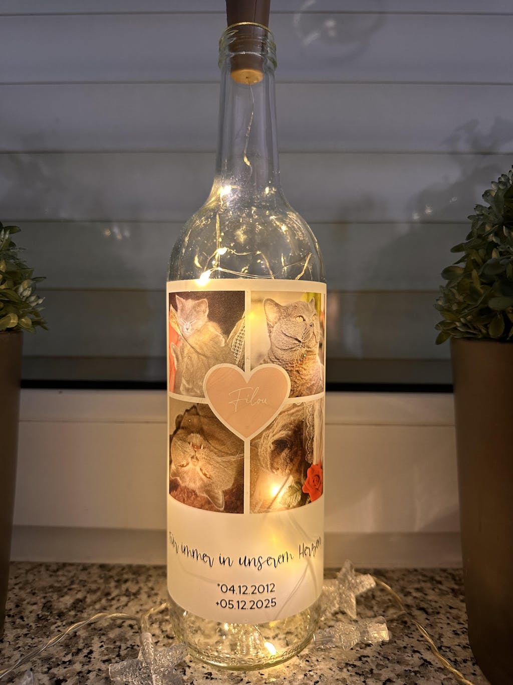 Wunderschöne Flasche, tolle Qualität. Sehr schöne Erinnerung. Nur leider sind die Batterien von der Lichterkette LR22, 3 Stück), nach 1 Tag schon leer.
