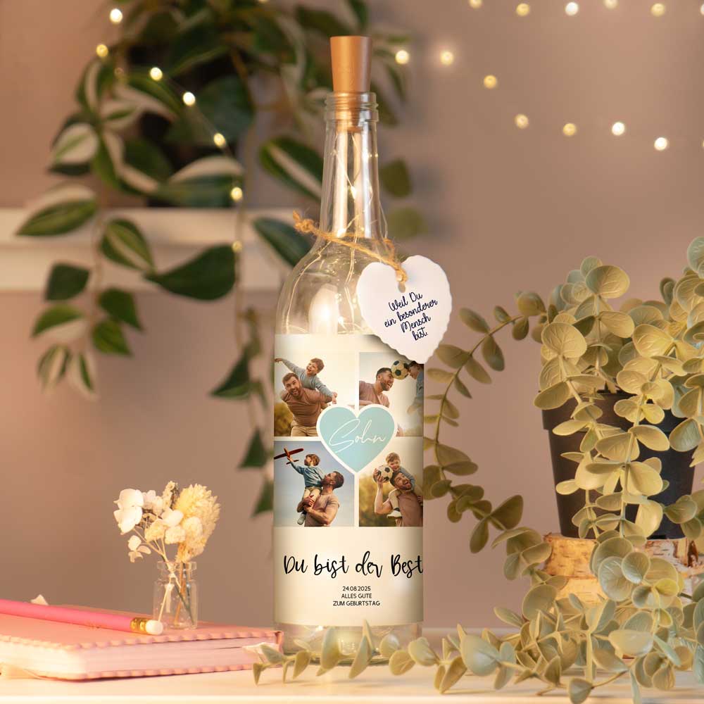 Erstelle deine eigene ganz persönliche „Fotocollage #2“ Lichterflasche und verschenke sie als unglaublich tolles Geschenk. Unsere Deko-Flasche ist mit einer Lichterkette sowie mit einem weißen Papier-Herz mit Kordel veredelt. Auf das Papierherzchen kannst du nochmals eine persönliche Widmung schreiben. Bei Dunkelheit spendet die galante Flasche ein warmes Licht und sorgt für ein angenehmes Wohlgefühl.