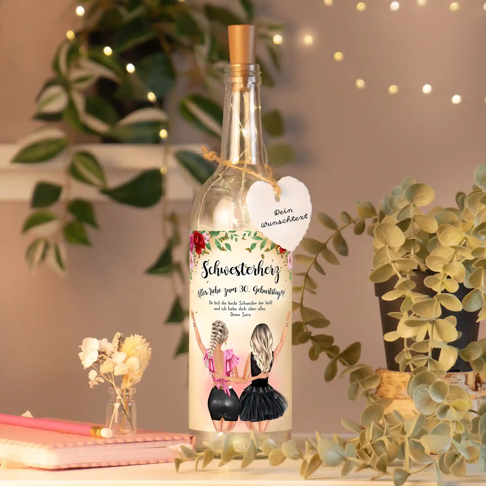 Erstelle deine eigene ganz persönliche Lichterflasche und verschenke sie als unglaublich tolles Geschenk. Unsere Deko-Flasche ist mit einer Lichterkette sowie mit einem weißen Papier-Herz mit Kordel veredelt. Auf das Papierherzchen kannst du nochmals eine persönliche Widmung schreiben. Bei Dunkelheit spendet die galante Flasche ein warmes Licht und sorgt für ein angenehmes Wohlgefühl.