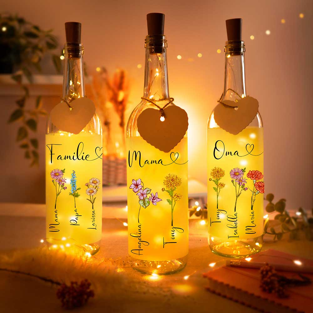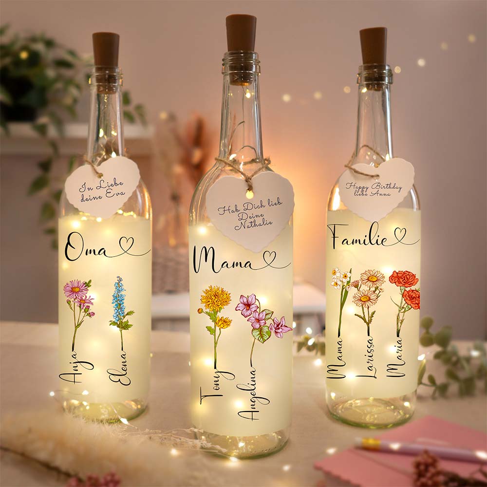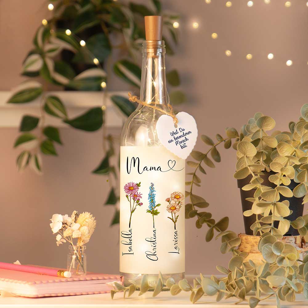 Erstelle deine eigene ganz persönliche "Geburtsblume" Lichterflasche und verschenke sie als unglaublich tolles Geschenk. Unsere Deko-Flasche ist mit einer Lichterkette sowie mit einem weißen Papier-Herz mit Kordel veredelt. Auf das Papierherzchen kannst du nochmals eine persönliche Widmung schreiben. Bei Dunkelheit spendet die galante Flasche ein warmes Licht und sorgt für ein angenehmes Wohlgefühl.