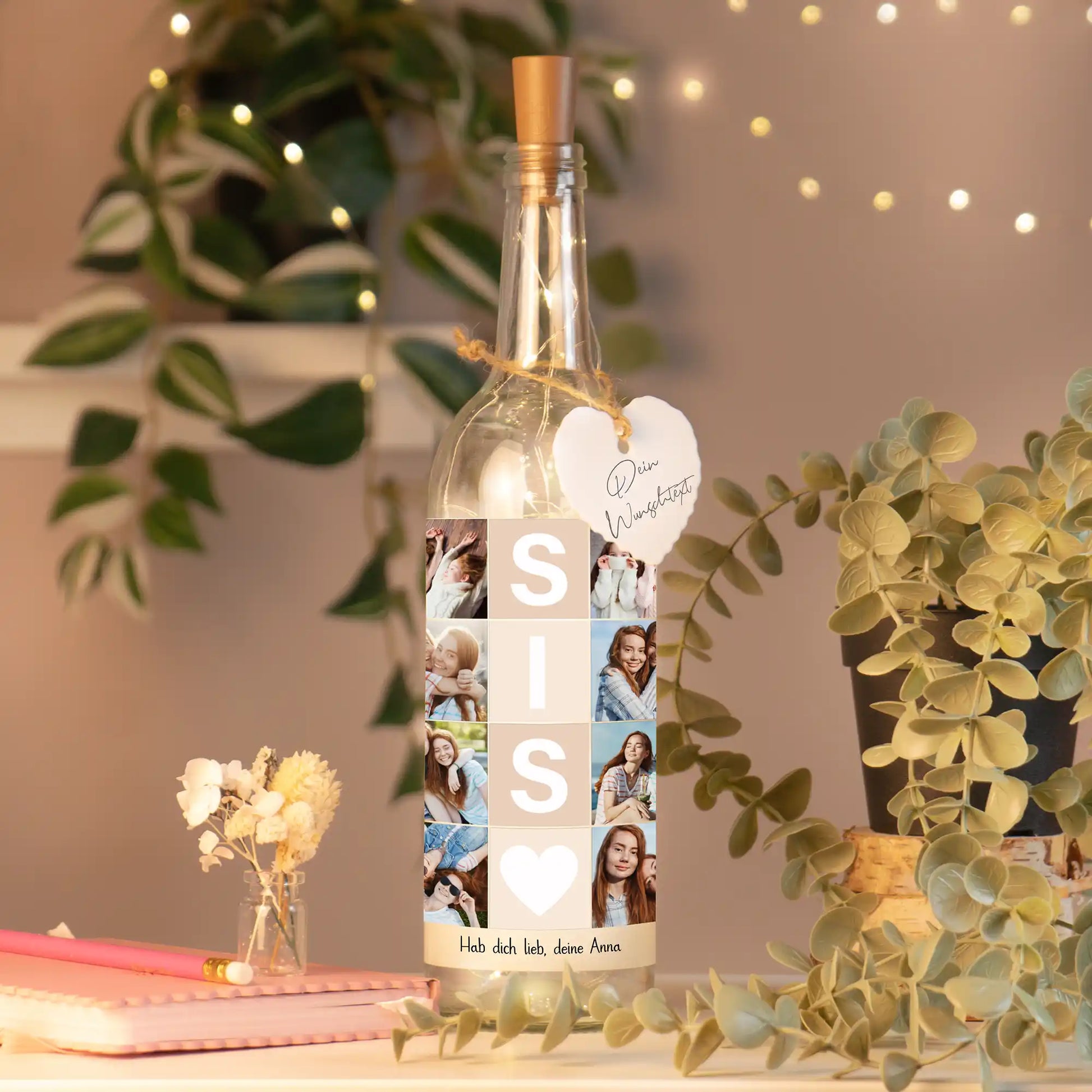 Erstelle deine eigene ganz persönliche Lichterflasche und verschenke sie als unglaublich tolles Geschenk. Unsere Deko-Flasche ist mit einer Lichterkette sowie mit einem weißen Papier-Herz mit Kordel veredelt. Auf das Papierherzchen kannst du nochmals eine persönliche Widmung schreiben. Bei Dunkelheit spendet die galante Flasche ein warmes Licht und sorgt für ein angenehmes Wohlgefühl.