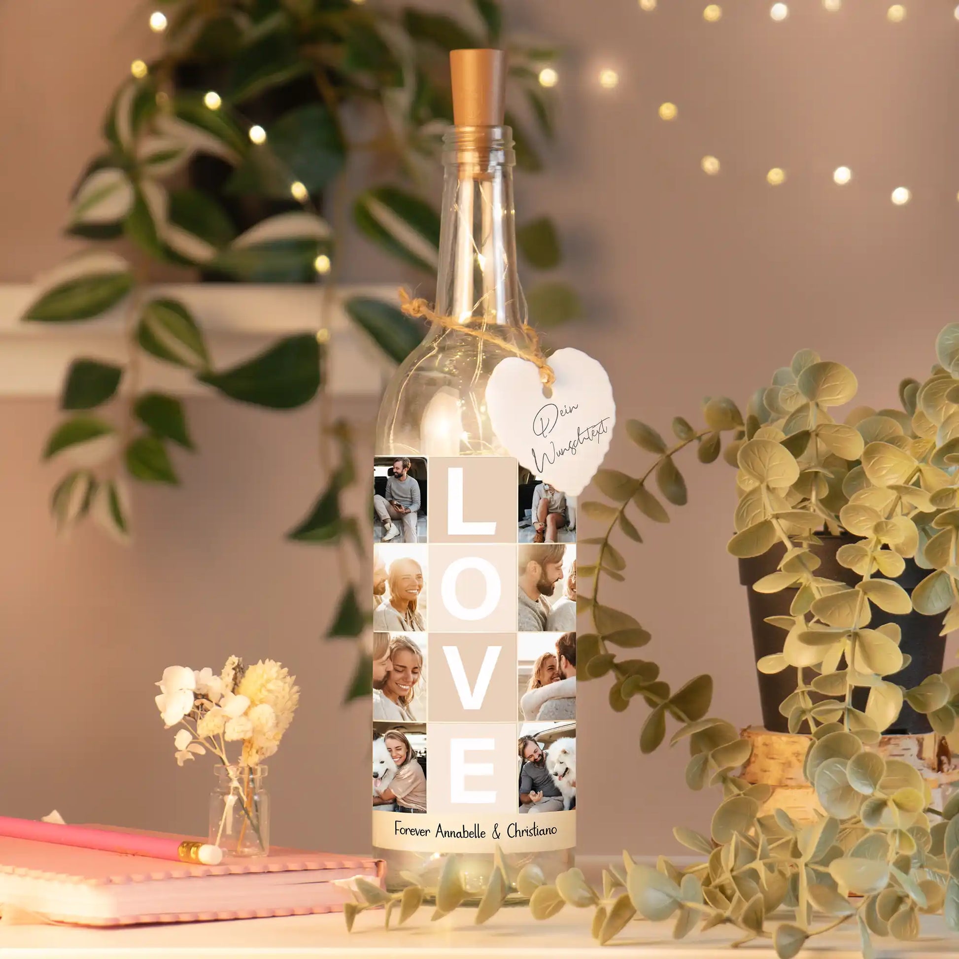 Erstelle deine eigene ganz persönliche Lichterflasche und verschenke sie als unglaublich tolles Geschenk. Unsere Deko-Flasche ist mit einer Lichterkette sowie mit einem weißen Papier-Herz mit Kordel veredelt. Auf das Papierherzchen kannst du nochmals eine persönliche Widmung schreiben. Bei Dunkelheit spendet die galante Flasche ein warmes Licht und sorgt für ein angenehmes Wohlgefühl.