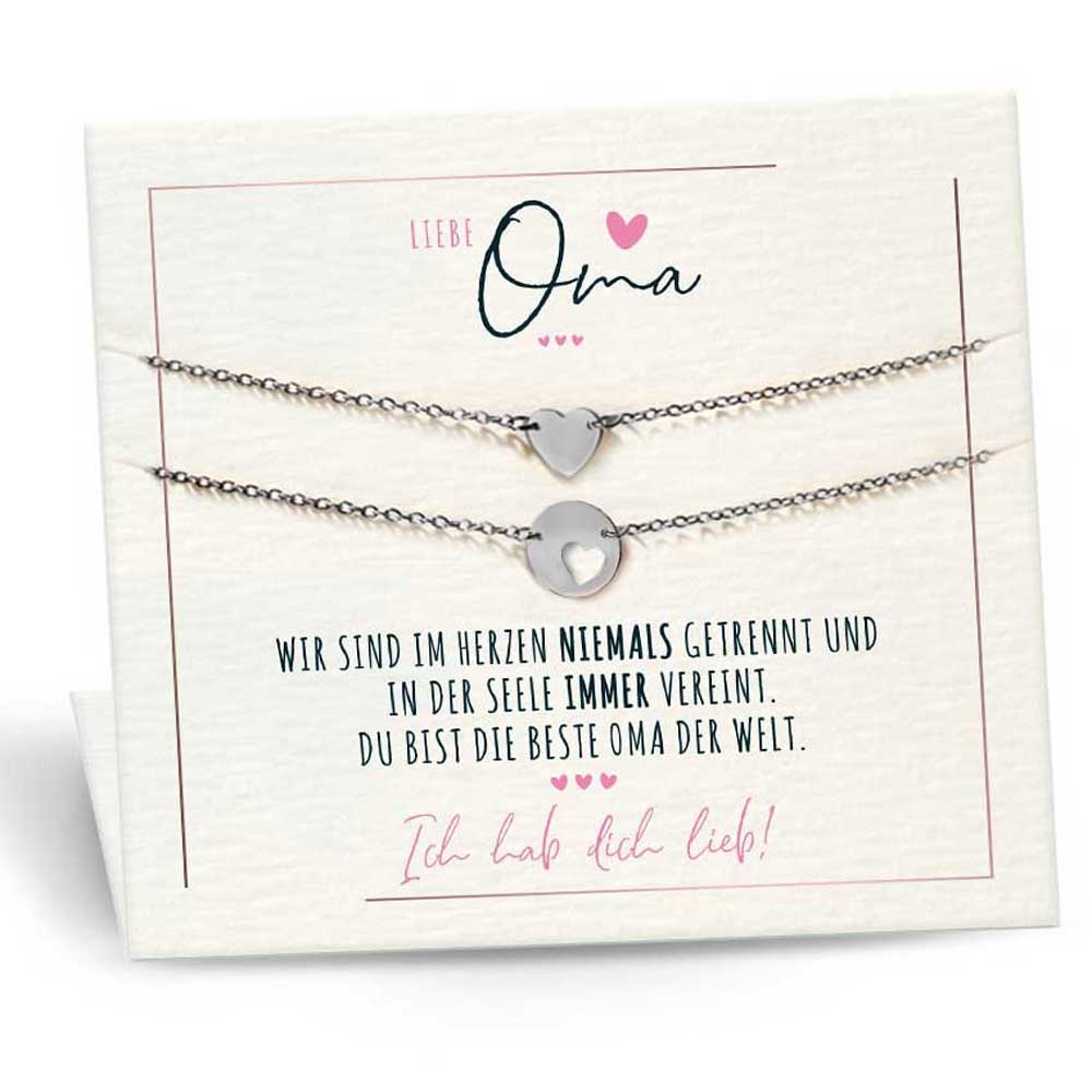 Herz-Armbänder auf Geschenkkarte. Die beiden Armbänder tragen jeweils ein Herzchen, die sich zu einem Kreis vereinen lassen. So kann die Beschenkte beide Armbänder zusammen tragen oder du & sie könnt euch die beiden Armbänder als ewige Freundschaftsarmbänder miteinander teilen, nach dem Motto "eins für dich & eins für mich". Zu dieser wundervollen Schmuckidee bekommst du eine hochwertige Geschenkkarte, auf der ein tiefsinniger und berührender Text geschrieben steht. So sind diese beiden Armbänder inklusive der Geschenkkarte ein zuckersüßes Geschenk für Menschen, die dir ganz ganz eng am Herzen liegen.
