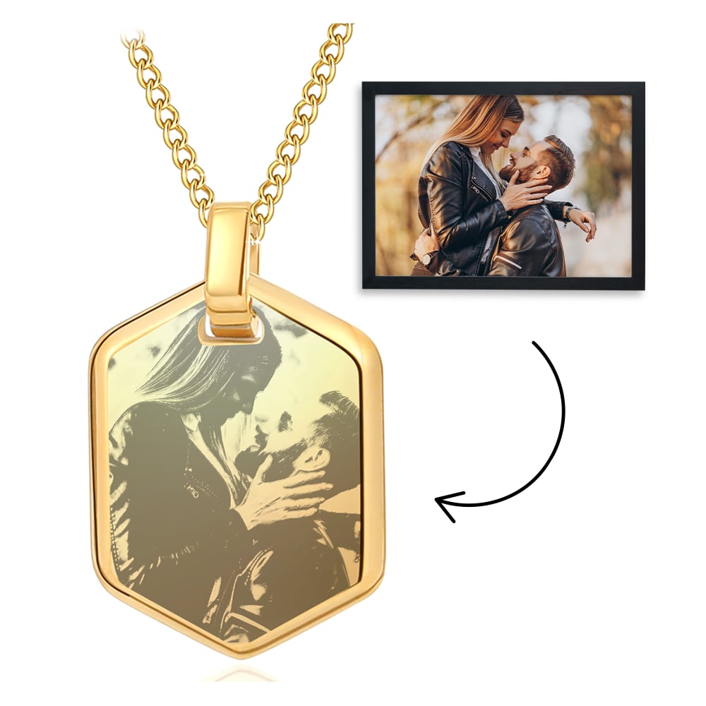 Unsere Herren-Halskette "Hexagon" trägt einen sechseckigen Anhänger. Auf diesen kannst dein Lieblingsbild gravieren lassen. Die Halskette selbst ist im Bereich von 50 cm bis 60 cm individuell einstellbar. Ein äußerst hochwertiges und angesagtes Schmuckstück für Herren.