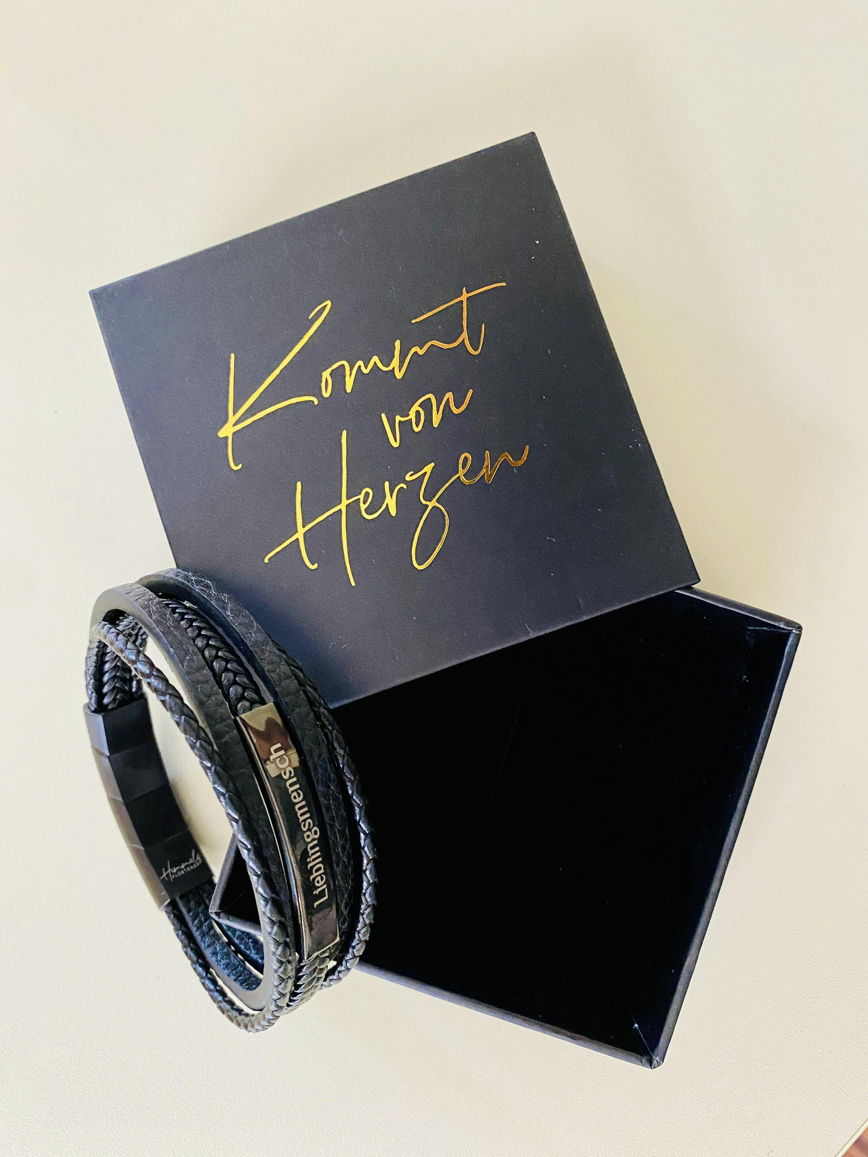 Gravurarmband für Herren aus echtem Leder und geschwärztem Edelstahl. Die Besonderheit: Das Armband besitzt zwei abnehmbare, magnetische Verlängerungsglieder, sodass Du das Armband in den Längen 21 cm, 22.5 cm und 24 cm variabel einstellen kannst. Damit ist gewährleistet, dass das Gravurarmband an jedes Herren-Handgelenk passt. Das hochwertige Echt-Leder in Kombination mit dem massiven, geschwärzten Edelstahl sorgen für höchsten Tragekomfort und für ein maskulines Aussehen. So ist das Armband ein Top-Accessoire für echte Typen. Einzigartiger Herren-Schmuck - auch das ist Himmelsflüsterer!