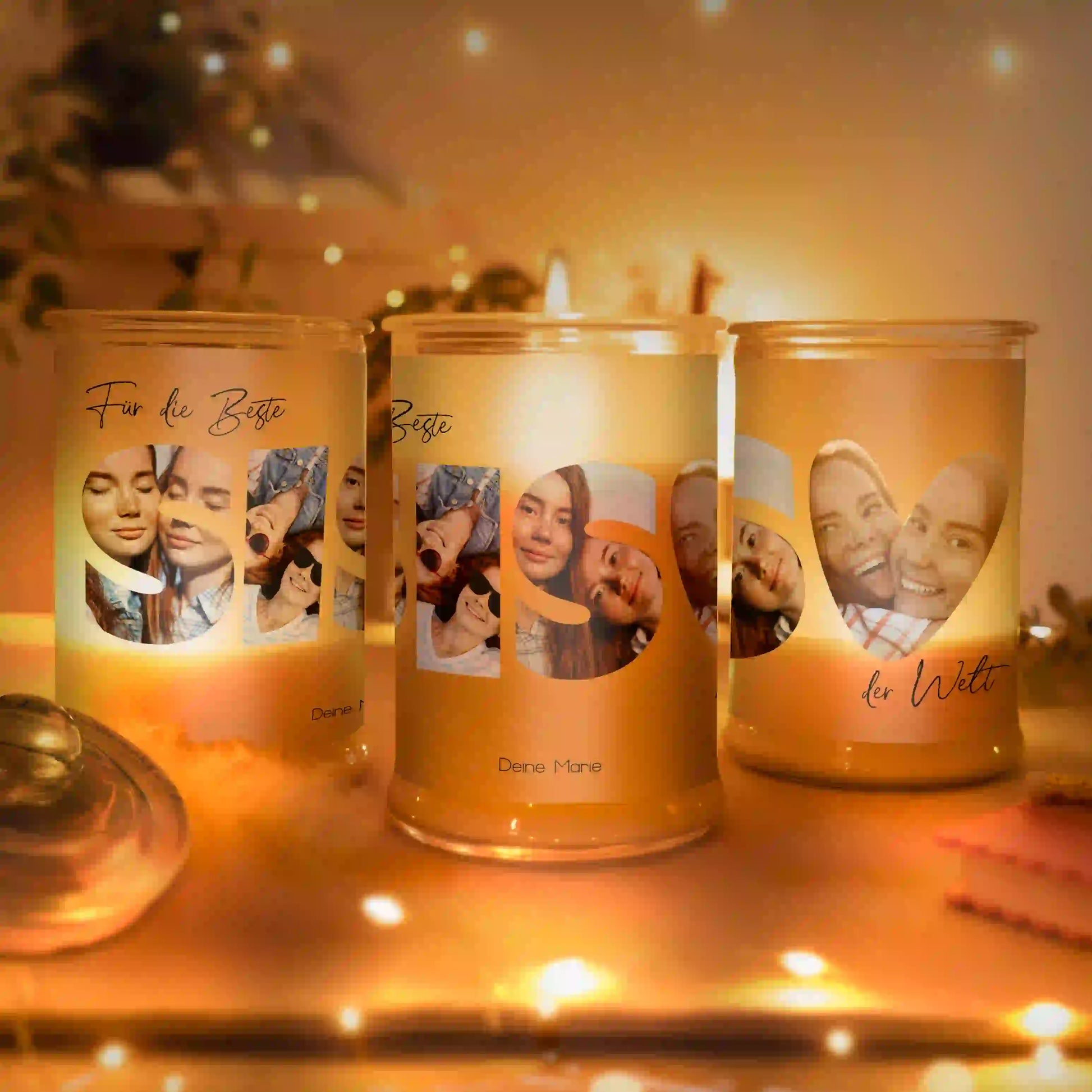 Personalisierbare Duftkerze für einen lieben Menschen, der dir nahe steht. Erstelle deine eigene ganz persönliche „Fotocollage #3“ Kerze als unglaublich schönes Geschenk. Unsere Duftkerzen werden von uns per Hand und aus 100% reinem Sojawachs gefertigt. Durch den Glasdeckel mit Gummi bleibt der Duft länger frisch und du kannst das Glas danach als dekoratives Aufbewahrungsglas verwenden! Einfach das Glas gründlich reinigen und fertig. Verwende es zur Dekoration als Windlicht, Aufbewahrungsgefäß, Teelicht - Glas oder aber als Pflanzentopf für Haus und Garten. Ideal als Geschenk zu Geburtstagen Weihnachten, Hochzeiten, zur Wohnungseinweihung oder einfach nur für Dich zum Wohlfühlen.