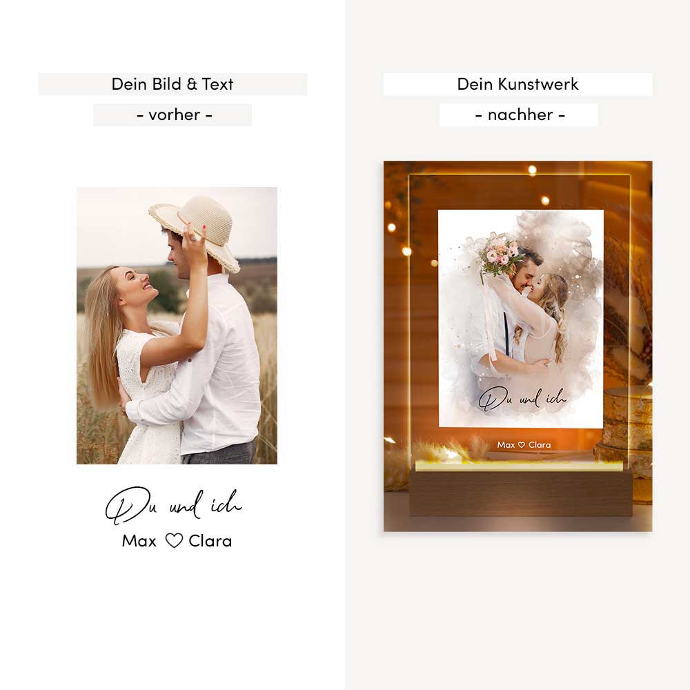 Verwandle deine Lieblingsfotos in ein einzigartiges Kunstwerk! Lade einfach dein eigenes Bild hoch, und wir verwandeln es in ein wunderschönes Aquarell. Dein Bild wird auf hochwertigem Acrylglas gedruckt und von einem stilvollen, beleuchteten LED-Holzsockel sanft beleuchtet – so wird aus deinem Kunstwerk ein beleuchtetes Meisterwerk. Die dezente Beleuchtung sorgt für eine stimmungsvolle Atmosphäre und lässt dein Bild in einem ganz neuen Licht erstrahlen. Da die Beleuchtung dimmbar ist, kannst du sie wunderbar deiner eigenen Stimmung anpassen. Wir liefern dir die LED-Lampe mit einem USB-Stecker sowie mit einem integrierten Batteriefach, damit bist du super flexibel zuhause und auf Reisen. Ein tolles, persönliches Geschenk oder ein stilvolles Highlight für dein Zuhause. Lass deine Erinnerungen in einem neuen Licht erstrahlen – handgefertigt und einzigartig!