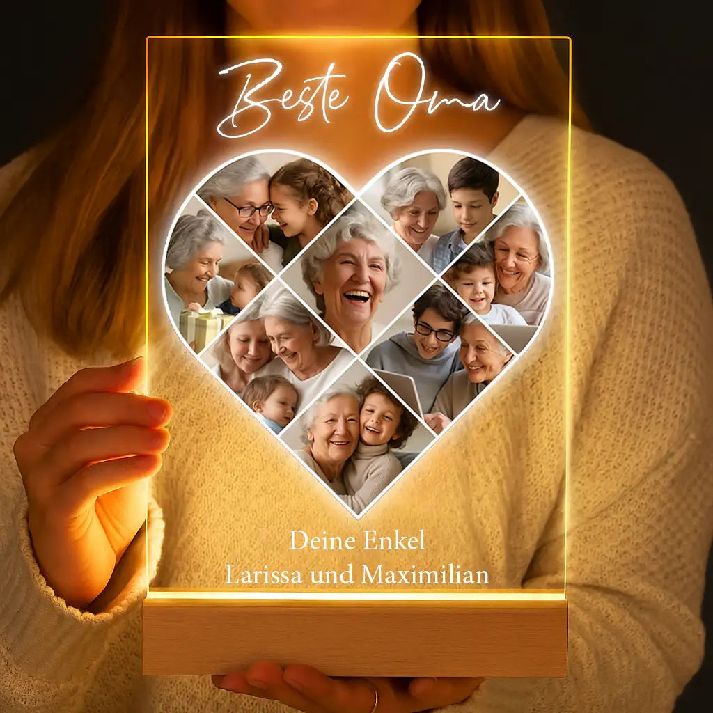 Erstelle dein eigenes ganz persönliches „Fotocollage #5“ Bild als unglaublich schönes Geschenk und verschenke es auf einer LED-Lampe aus Acrylglas (DIN A5).