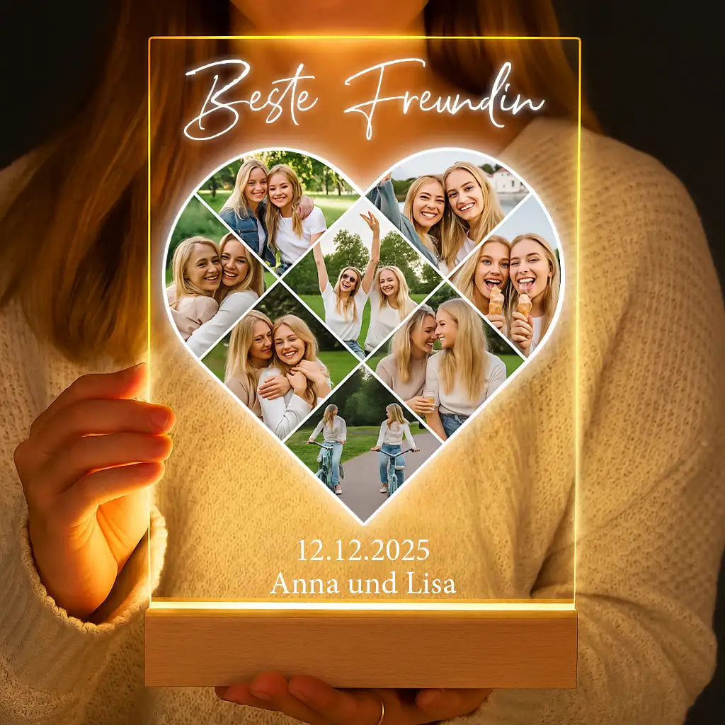 Erstelle dein eigenes ganz persönliches „Fotocollage #5“ Bild als unglaublich schönes Geschenk und verschenke es auf einer LED-Lampe aus Acrylglas (DIN A5).