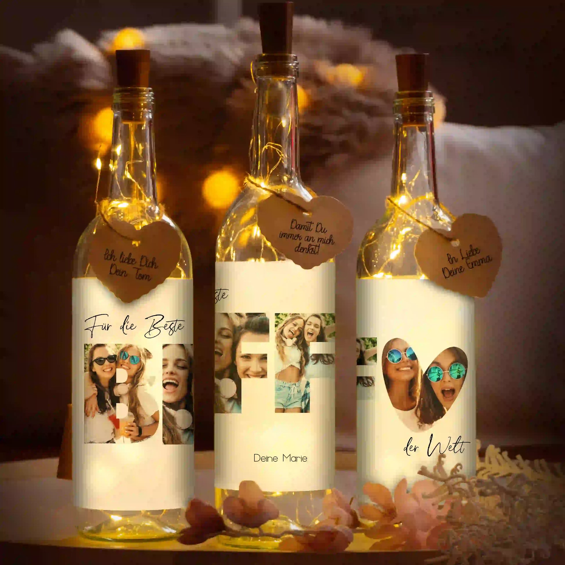 Erstelle deine eigene ganz persönliche „Fotocollage #3“ Lichterflasche und verschenke sie als unglaublich tolles Geschenk. Unsere Deko-Flasche ist mit einer Lichterkette sowie mit einem weißen Papier-Herz mit Kordel veredelt. Auf das Papierherzchen kannst du nochmals eine persönliche Widmung schreiben. Bei Dunkelheit spendet die galante Flasche ein warmes Licht und sorgt für ein angenehmes Wohlgefühl.