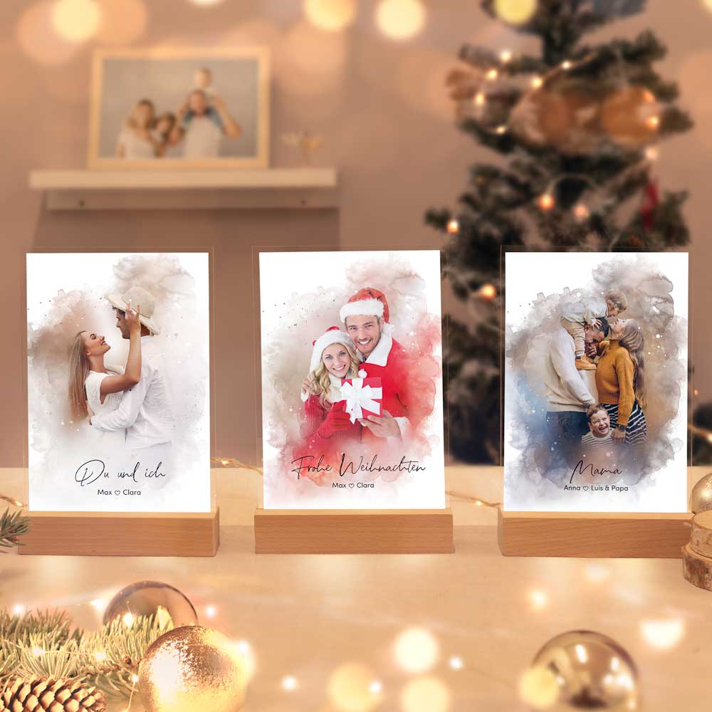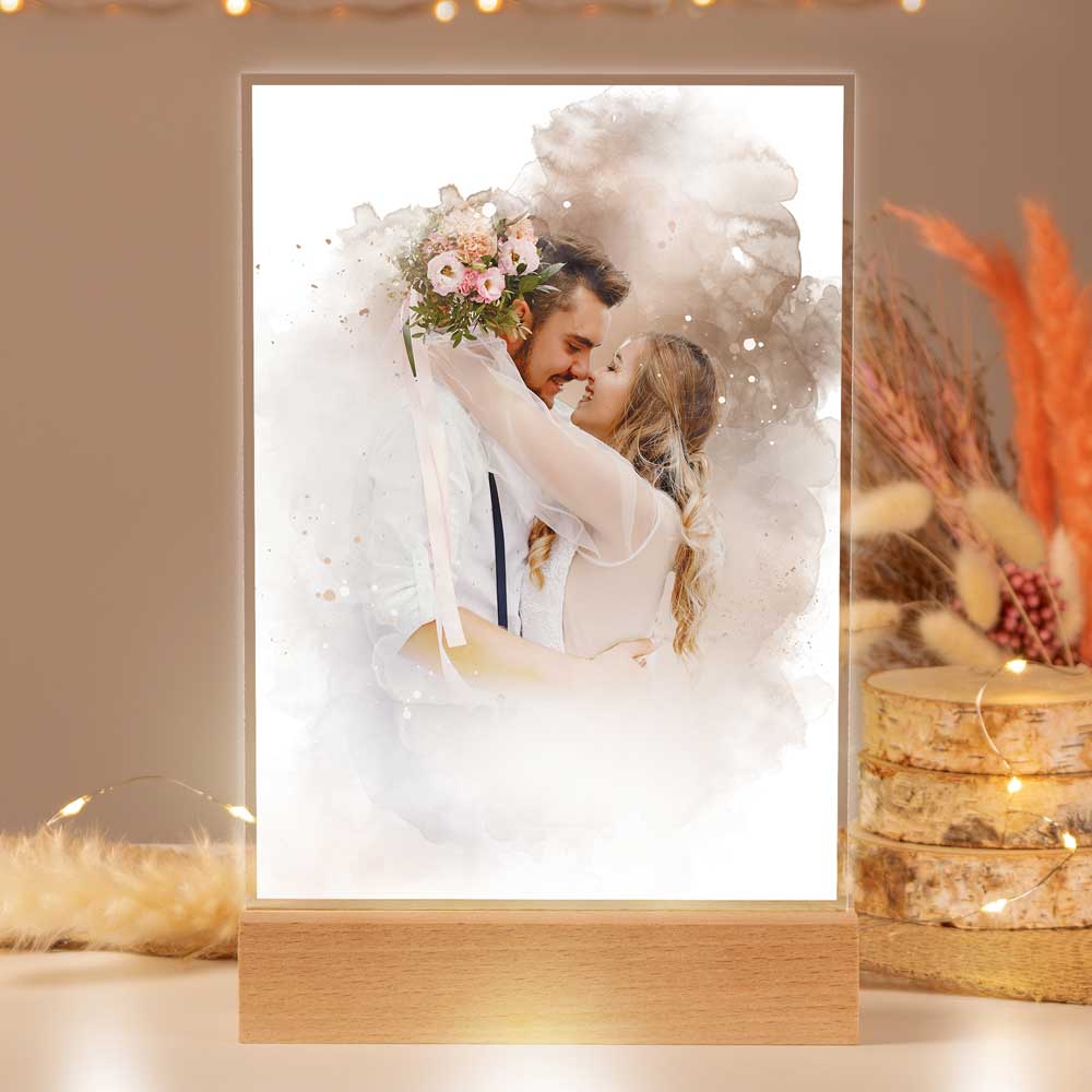 Verwandle deine Lieblingsfotos in ein einzigartiges Kunstwerk! Lade einfach dein eigenes Bild hoch, und wir verwandeln es in ein wunderschönes Aquarell. Dein Bild wird auf hochwertigem Acrylglas gedruckt und mit einem stilvollen, von uns selbst hergestellten Holzsockel geliefert. Ein tolles, persönliches Geschenk oder ein stilvolles Highlight für dein Zuhause. Lass deine Erinnerungen in einem neuen Licht erstrahlen – handgefertigt und einzigartig!