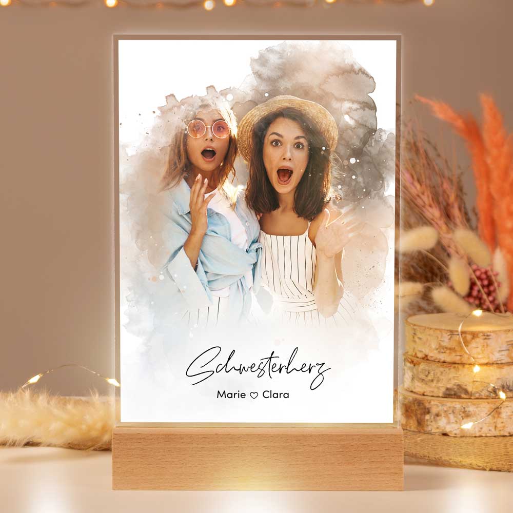 Verwandle deine Lieblingsfotos in ein einzigartiges Kunstwerk! Lade einfach dein eigenes Bild hoch, und wir verwandeln es in ein wunderschönes Aquarell. Dein Bild wird auf hochwertigem Acrylglas gedruckt und mit einem stilvollen, von uns selbst hergestellten Holzsockel geliefert. Ein tolles, persönliches Geschenk oder ein stilvolles Highlight für dein Zuhause. Lass deine Erinnerungen in einem neuen Licht erstrahlen – handgefertigt und einzigartig!