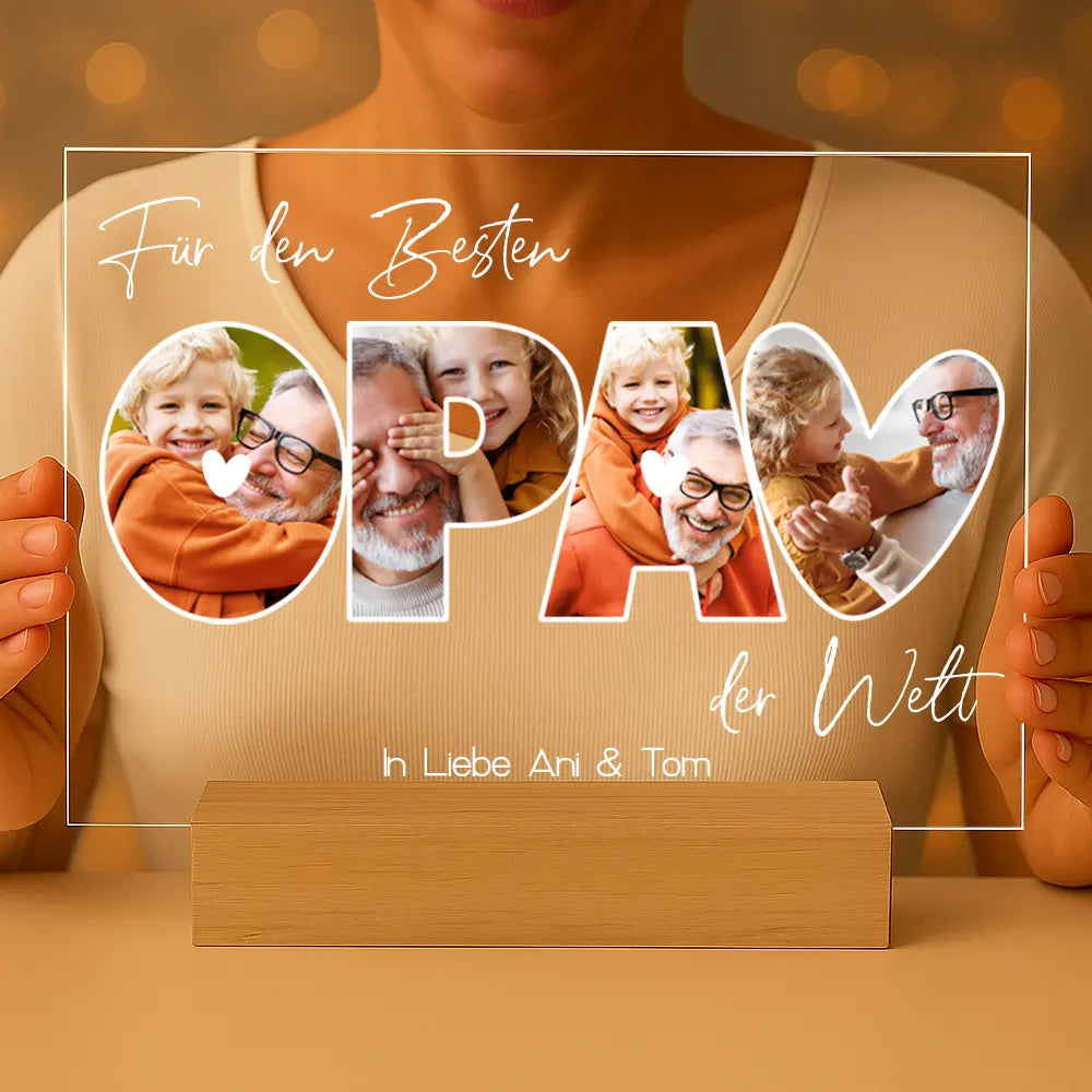 Erstelle dein eigenes ganz persönliches „Fotocollage #3“ Bild als unglaublich schönes Geschenk und verschenke es auf einem Acrylglas mit Holzfuß (DIN A5).