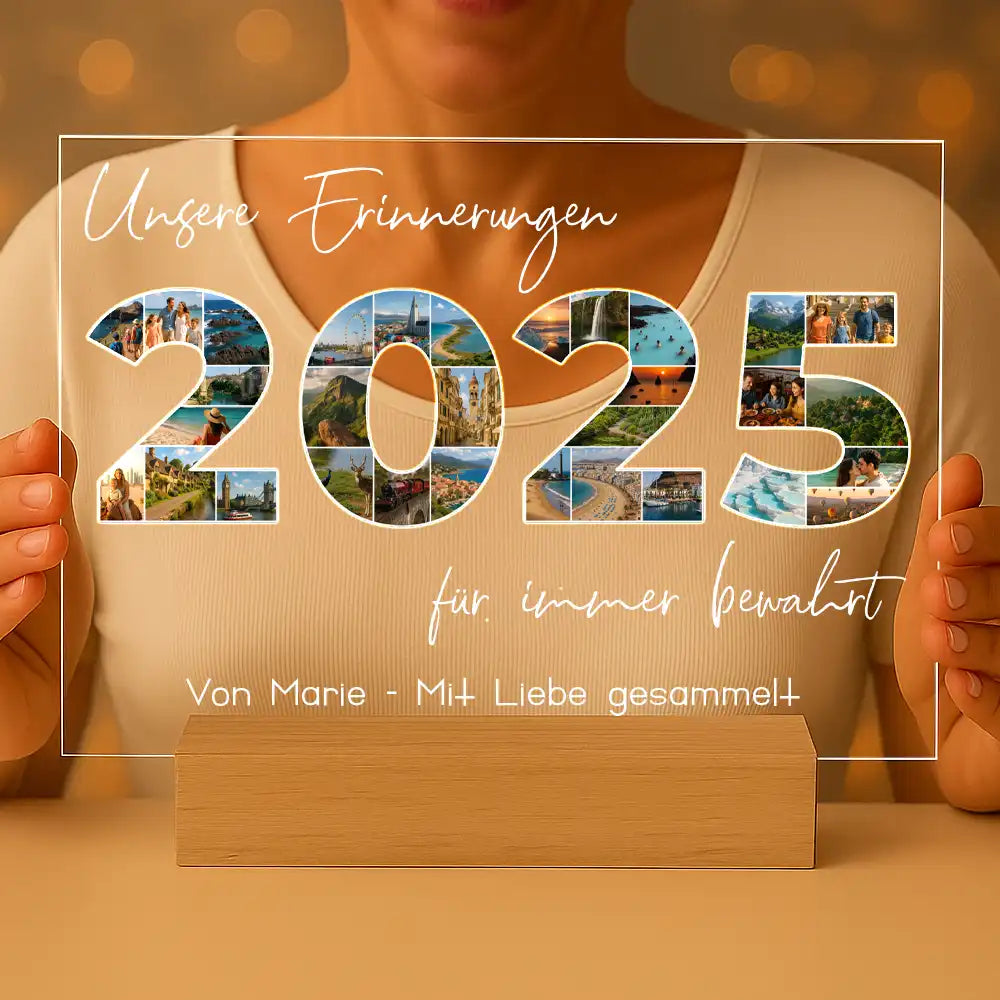 Erstelle dein eigenes ganz persönliches „Fotocollage #3“ Bild als unglaublich schönes Geschenk und verschenke es auf einem Acrylglas mit Holzfuß (DIN A5).