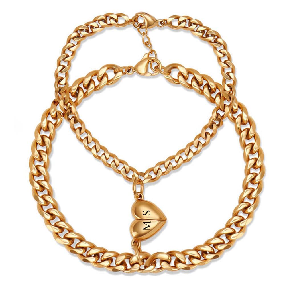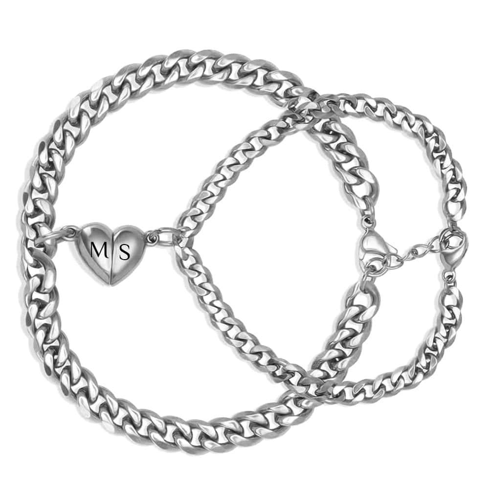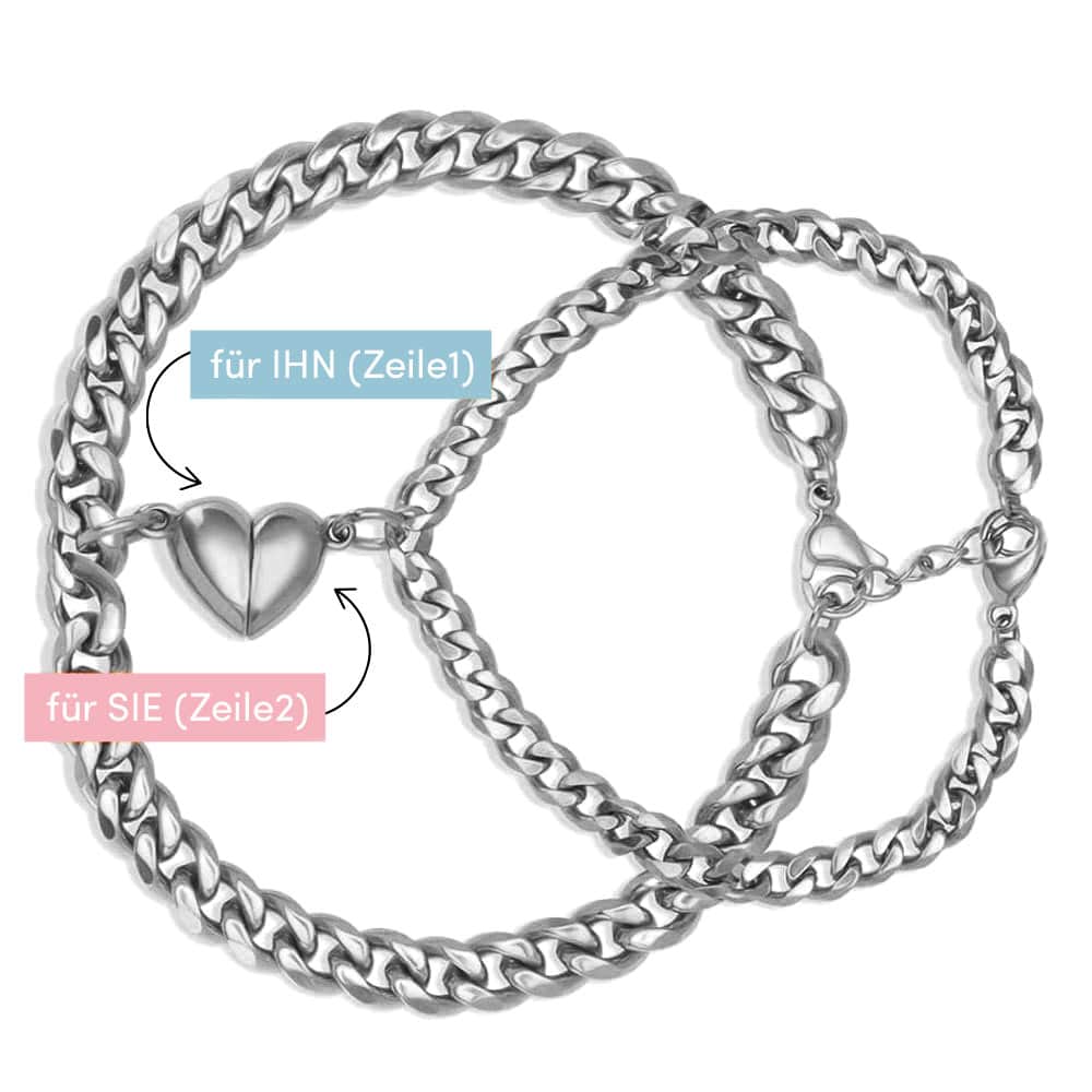Du bekommst 2 Panzerketten-Armbänder die anhand eines Herzens miteinander verbunden sind. Das Herz teilt sich mittig und wenn du und dein Partner wieder zusammen kommt, verbinden sich die Herz-Seiten auf magische miteinander (mittels Magnet :-)). Auf jedes herz kannst du einen Buchstaben als Initiale gravieren lassen. Love - always and forever!